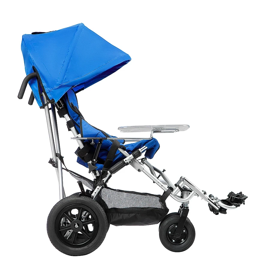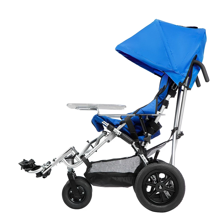 Дополнительно данная модель коляски «трость» для детей с ДЦП оснащена удлинителем для спины, функцией регулировки угла наклона спинки, а также съемным столиком.