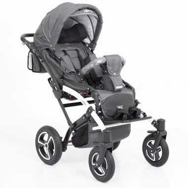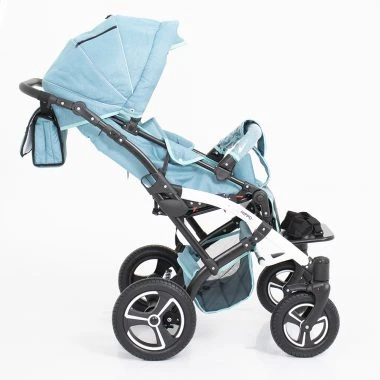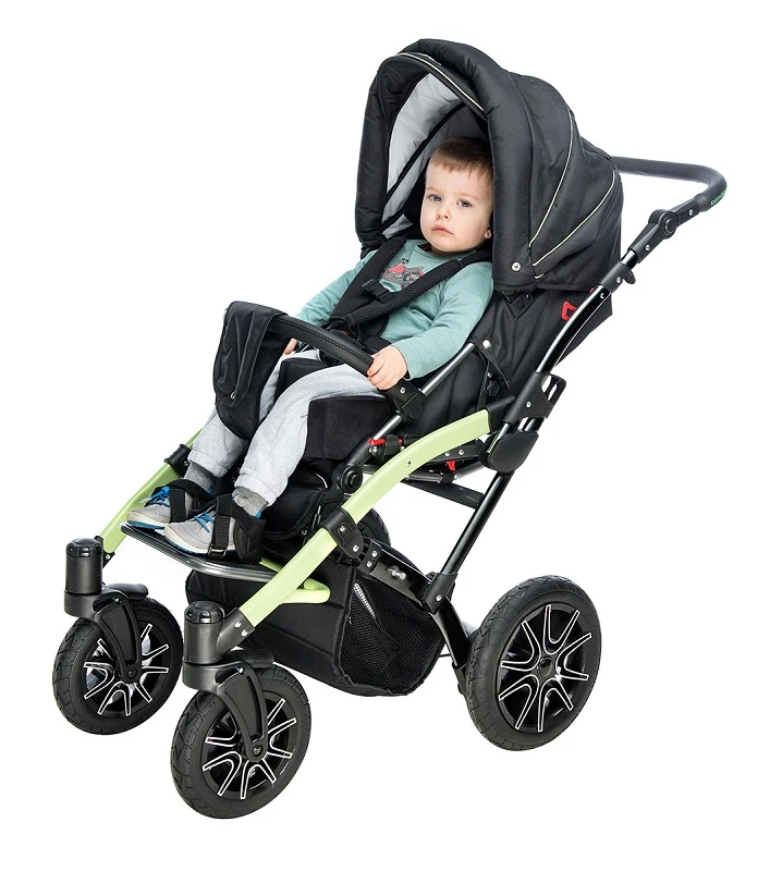 Инвалидная коляска для детей с ДЦП имеет поворотное сиденье и колеса, козырек для защиты от ярких солнечных лучей или непогоды, систему амортизации и ремней безопасности, подушки для помощи в принятии стабильного положения конечностей,