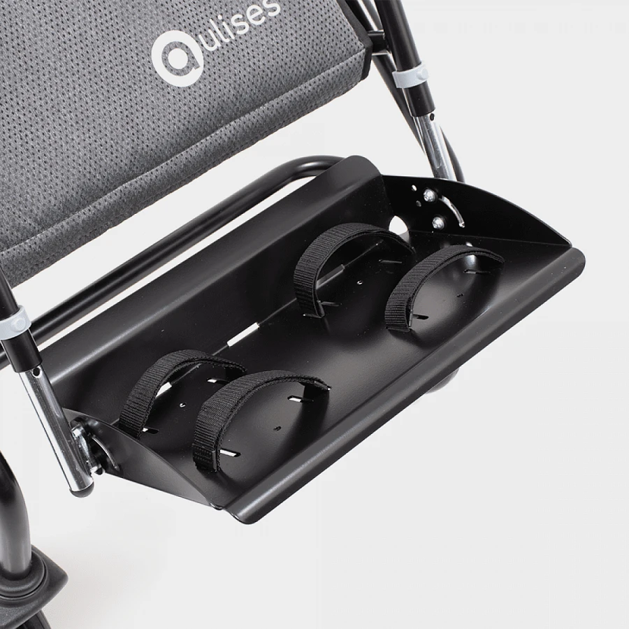 - Подножка с регуляцией длины и угла наклона, оснащенная 4-точечными ремнями, стабилизирующими стопы,