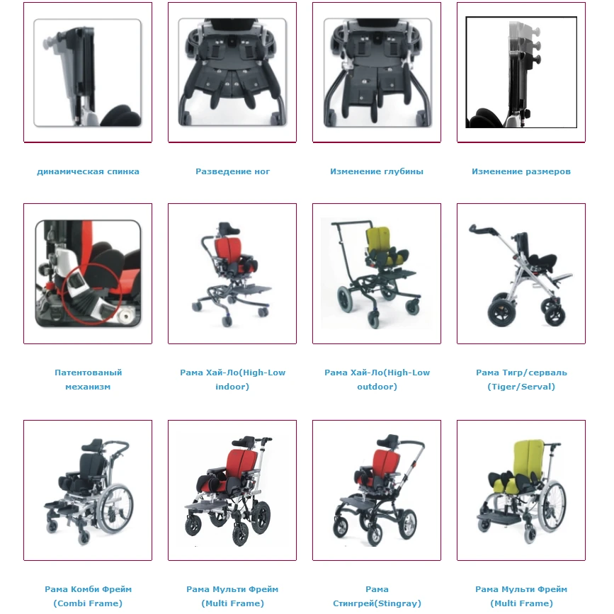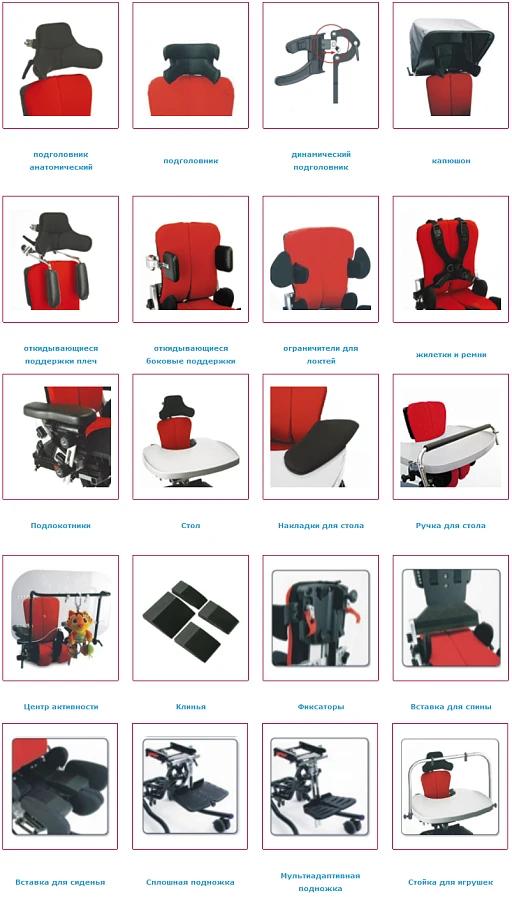 Большое количество аксессуаров (различные виды подголовников, боковых поддержек туловища, подножек, столов, ремней, жилеток и т.д.) позволяют индивидуально подбирать стул, учитывая физиологические особенности и функциональные возможности ребенка