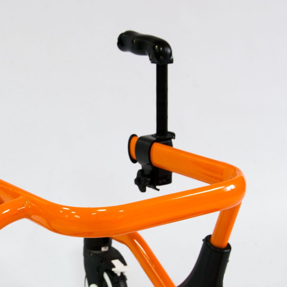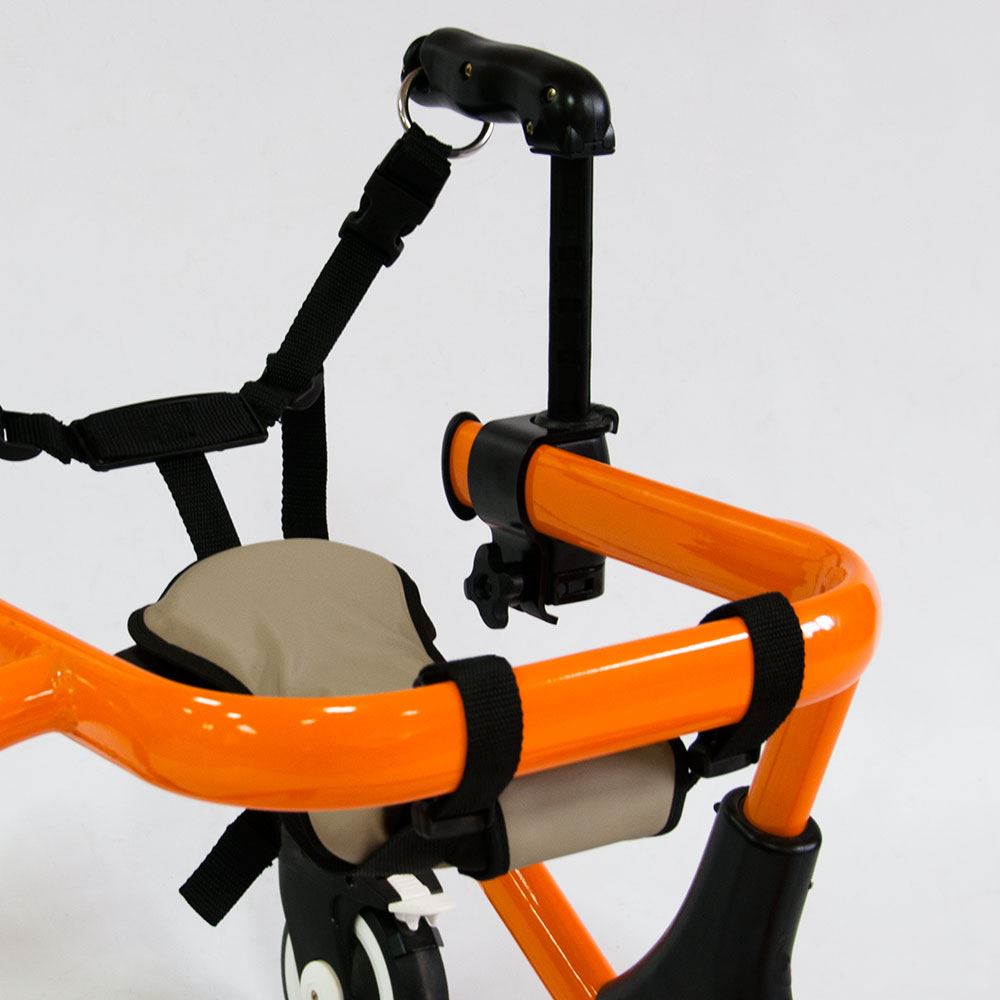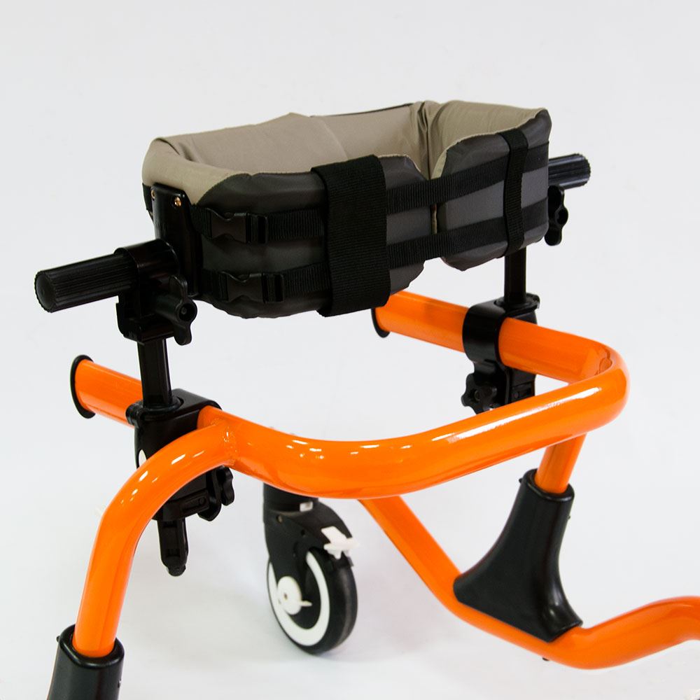 Мягкий фиксатор грудной клетки поддерживает туловище в требуемом положении. Высота фиксатора, угол его крепления и объем (под различные размеры туловища) регулируются. Все регулировки осуществляются, когда пациент находится в опорах-ходунках, что обеспечивает максимальную точность подгонки.