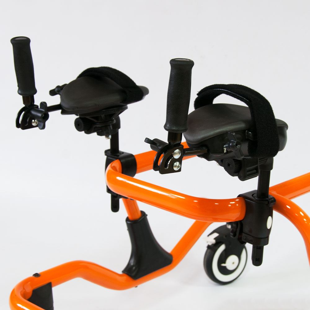 Подлокотники регулируются по пяти параметрам: высота, вперед-назад, ротация, угол, расстояние до тела. Применяются для поддержания веса пациента (в том числе с наклоном вперед), для контроля положения головы и туловища, для фиксации пациента в определенном положении для различных занятий.