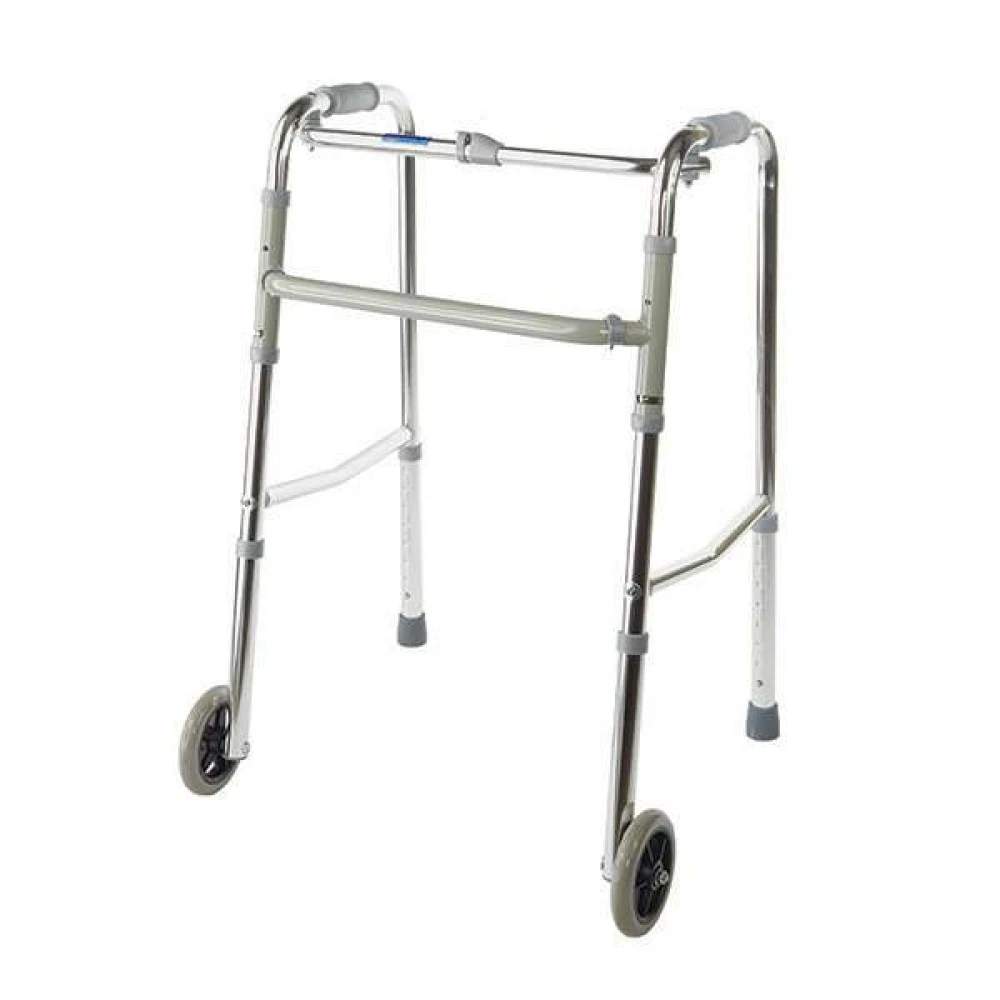 Опоры-ходунки с двумя колесами с шагом и без него оснащены 1 парой колес, расположенных фронтально. Их диаметр составляет 5 дюймов, или 12, 7 см. Благодаря их наличию, перемещение пользователя становится проще, а нагрузка на руки при этом становится минимальной.