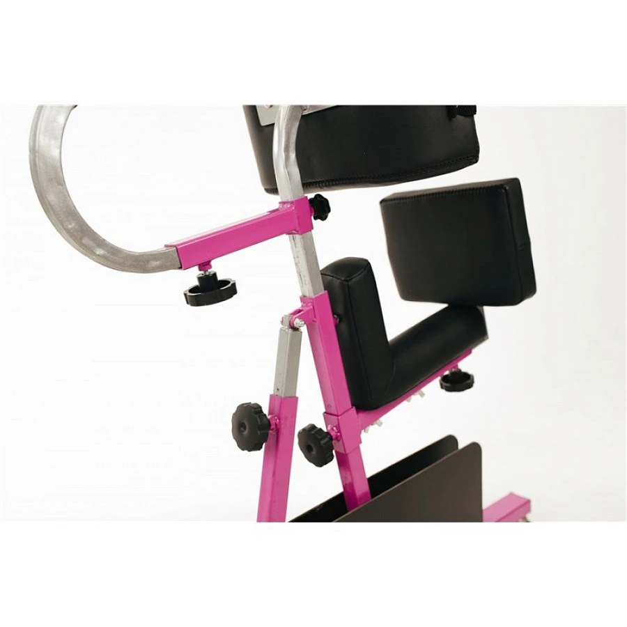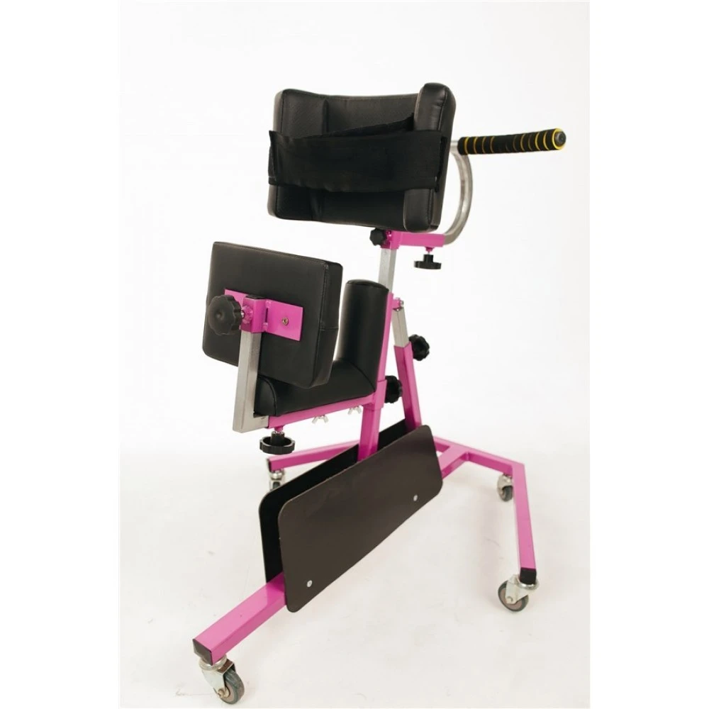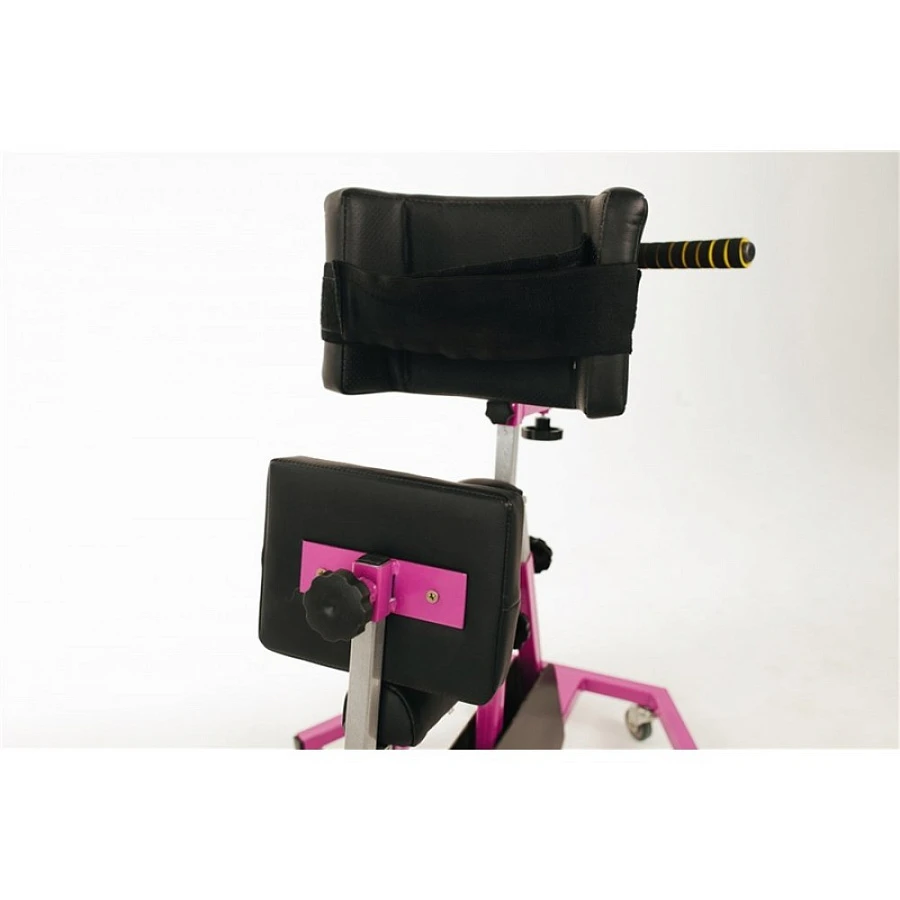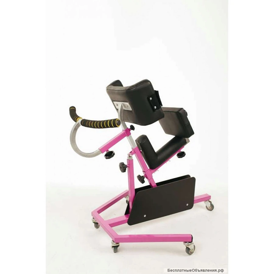 - Конструкция: 5-х колесная рама в форме стрелы, сиденье, задний упор для таза, разделитель для ног, поддержка туловища, нескользящие рукоятки, ремень,