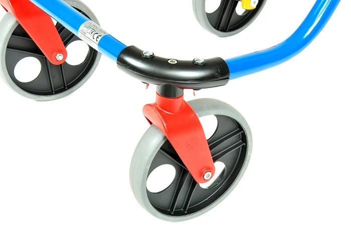 Ходунки установлены на колесики с резиновыми шинами. Также изделие имеет специальные тормозные элементы и фиксаторы. Это делает передвижение ребенка безопасным, исключает случайное скольжение.