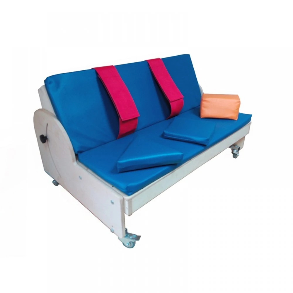 Опора состоит из металлического основания (рамы) на колесах со стояночными тормозами, деревянных боковин, сидения-ложа с мягким матрасиком, спинки с мягкой накладкой (матрасиком на спинку), грудного и тазобедренного ремней (креплений) с регулировкой по длине, трех мягких абдукционных модулей различной формы "квадрат", "треугольник", "трапеция".