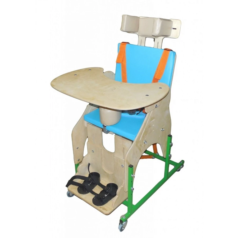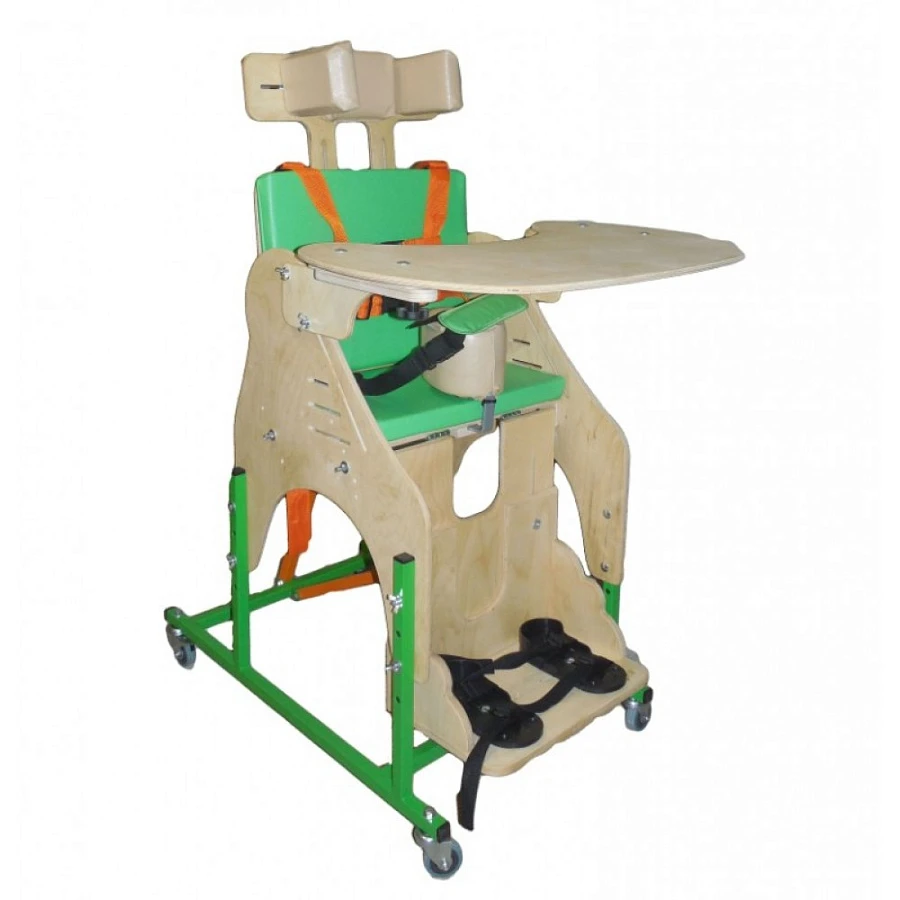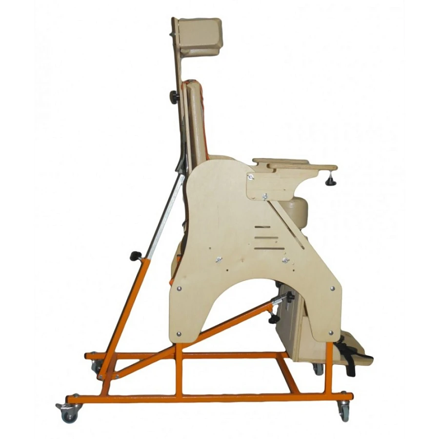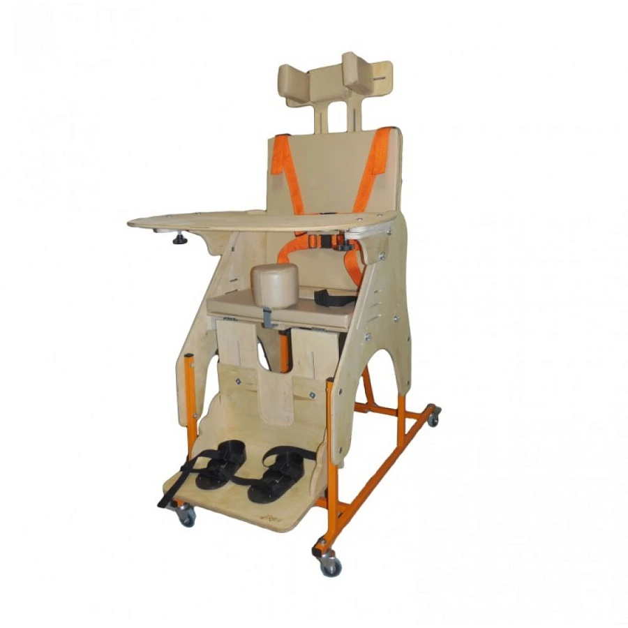 Опора состоит из металлической основы на ножках (по выбору может располагаться на колесах с тормозами - дополнительное оборудование), деревянных боковин с регулируемыми подлокотниками, кресла с регулируемыми спинкой и сидением, регулируемой подножки с креплениями для стоп, системы ремней для крепления тела. Дополнительно могут поставляться регулируемый подголовник, регулируемый столик, комплекты подушек для регулирования ширины сидения и спинки.
