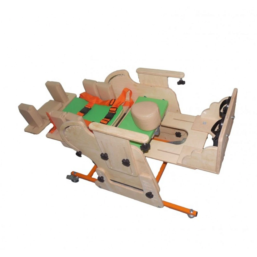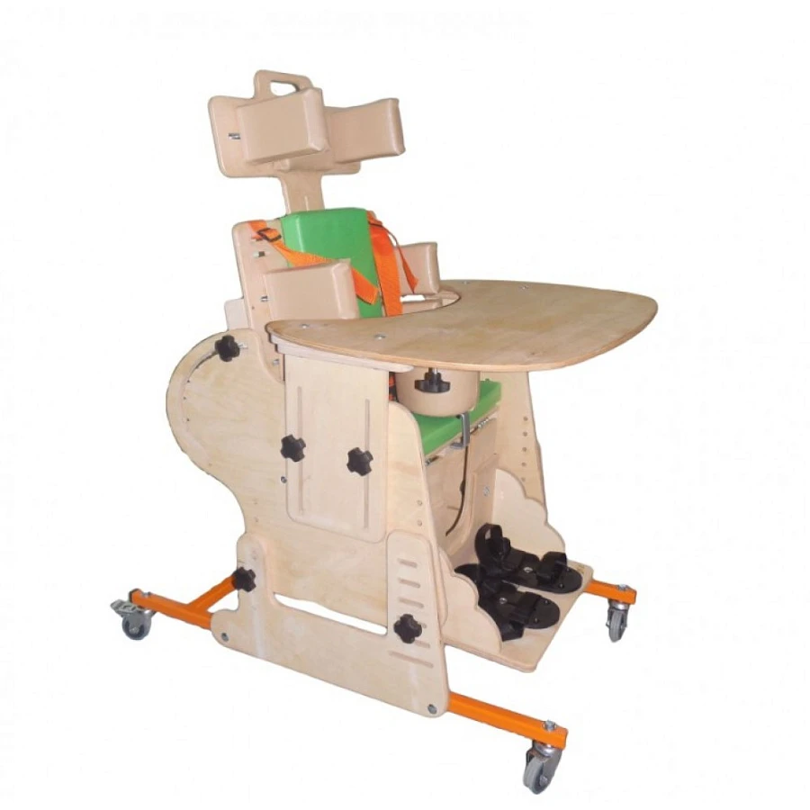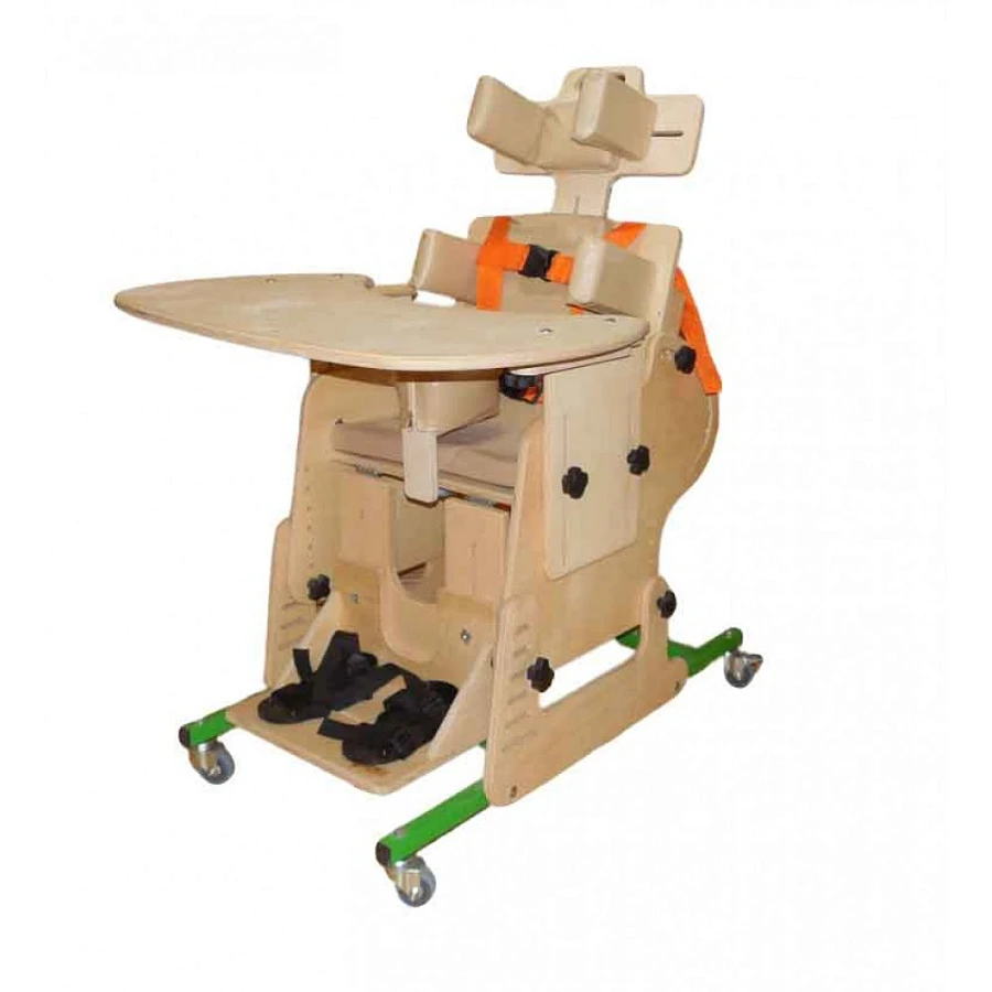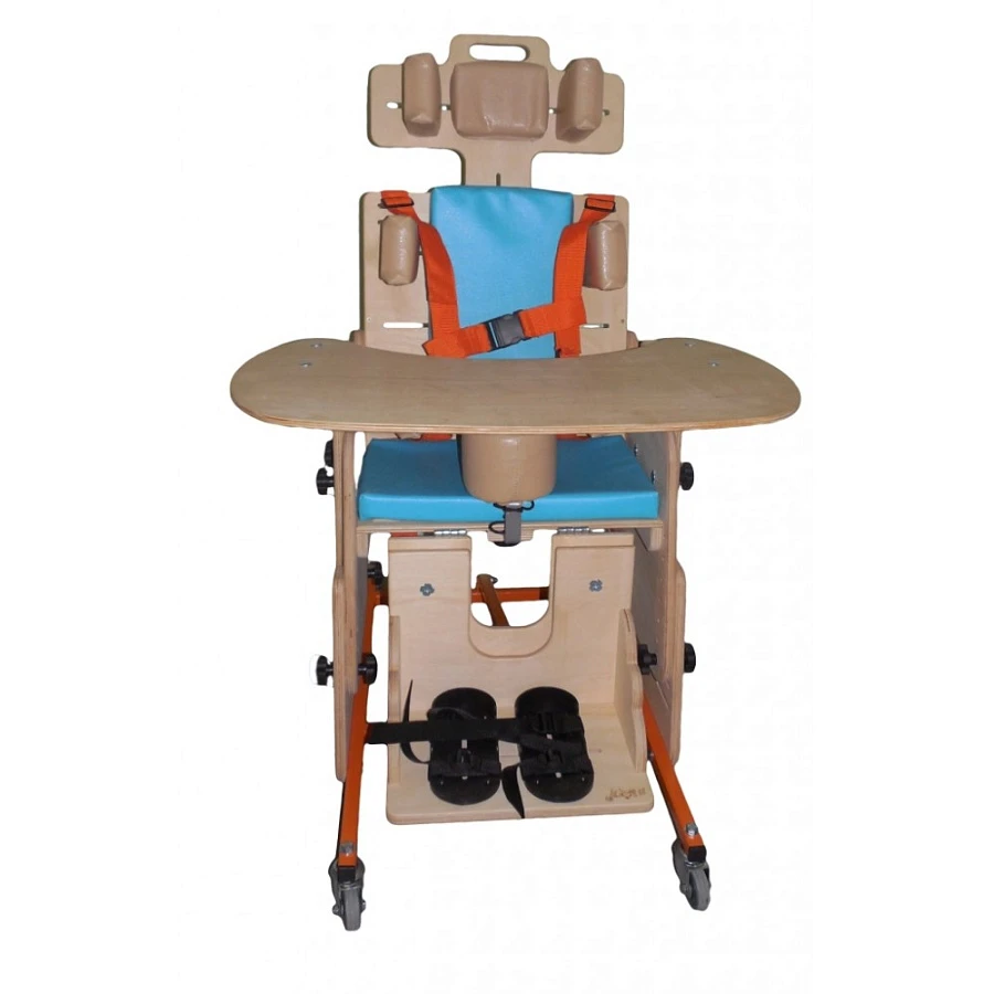 Опора для сидения представляет собой ортопедическое кресло на деревянной раме, расположенной на металлическом четырехколесном основании. Все колеса поворотные, задние колеса оснащены стояночными тормозами. Сидение и спинка оснащены съемными мягкими подушками и мягкими упорами-ограничителями. На подножке расположены пластиковые крепления для ступней типа «сандалии» с задними упорами и крепежными ремешками. Опора оснащена подголовником и съемным столиком, устанавливаемым на подлокотники.