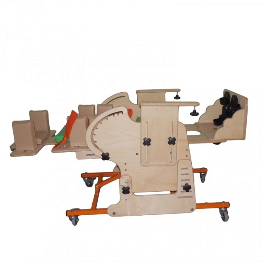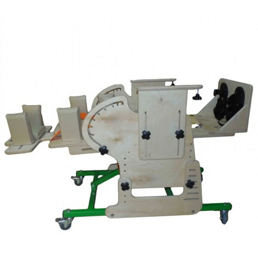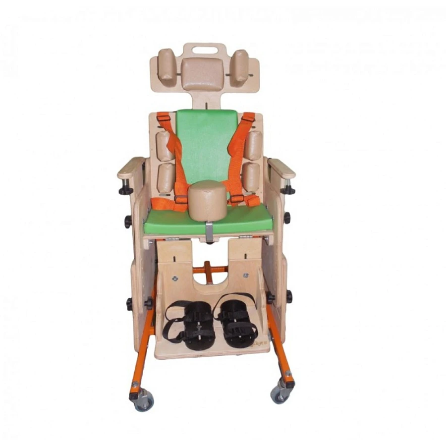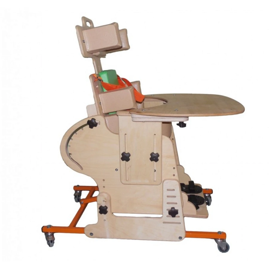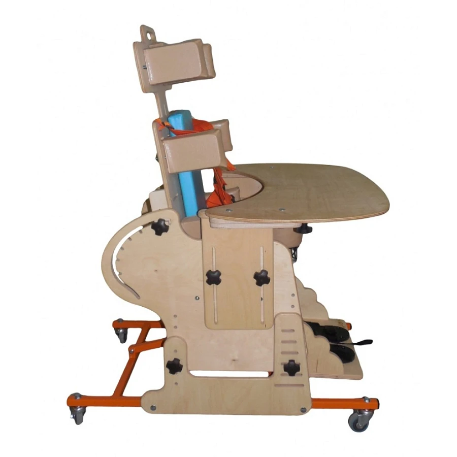 Опора для сидения представляет собой ортопедическое кресло на деревянной раме, расположенной на металлическом четырехколесном основании. Все колеса поворотные, задние колеса оснащены стояночными тормозами. Сидение и спинка оснащены съемными мягкими подушками и мягкими упорами-ограничителями. На подножке расположены пластиковые крепления для ступней типа «сандалии» с задними упорами и крепежными ремешками. Опора оснащена подголовником и съемным столиком, устанавливаемым на подлокотники.