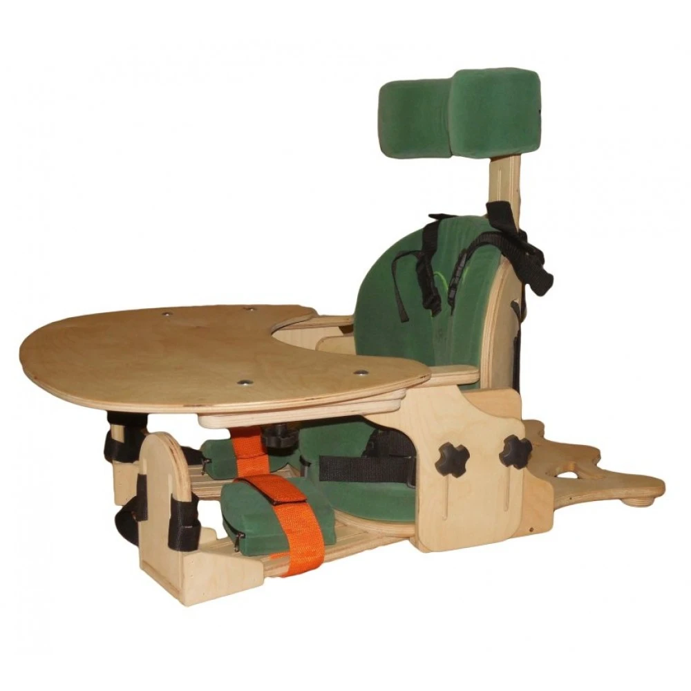 - Широкие возможности дополнительной комплектации: возможность установки подлокотников, регулируемого столика и столика с тренажёрами для развития мелкой моторики, независимо регулируемых креплений для ног, подголовника.