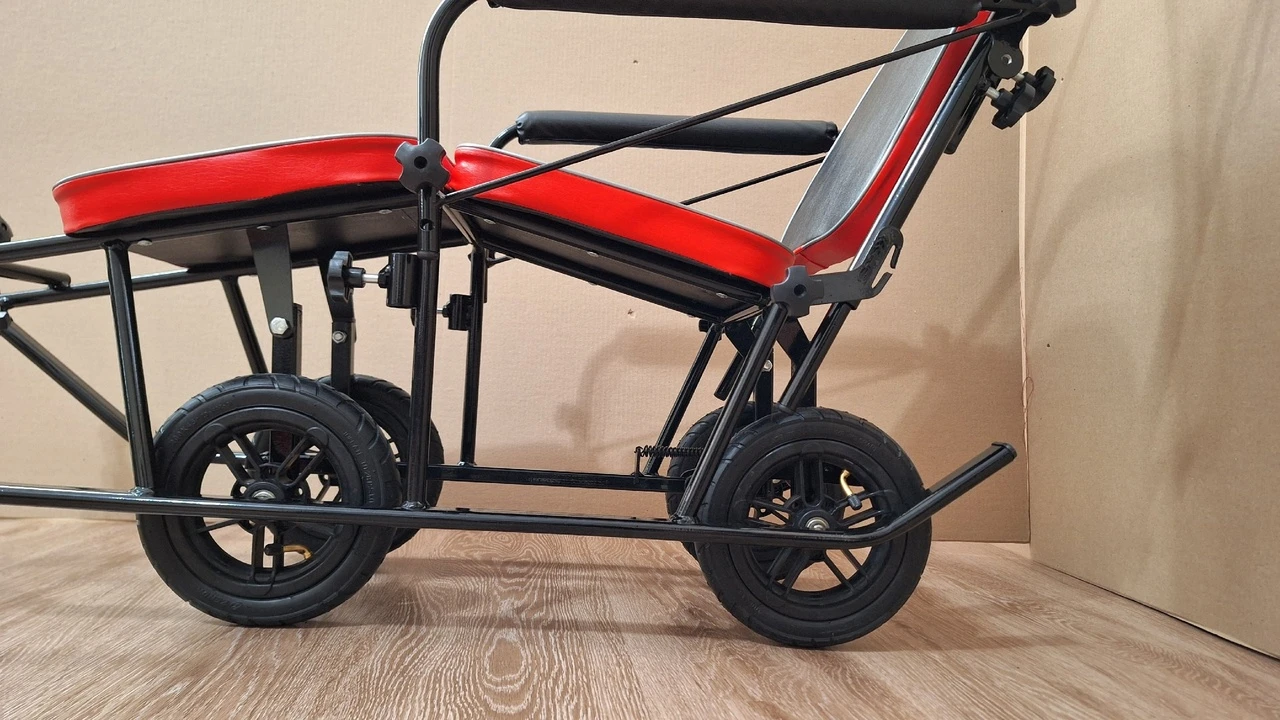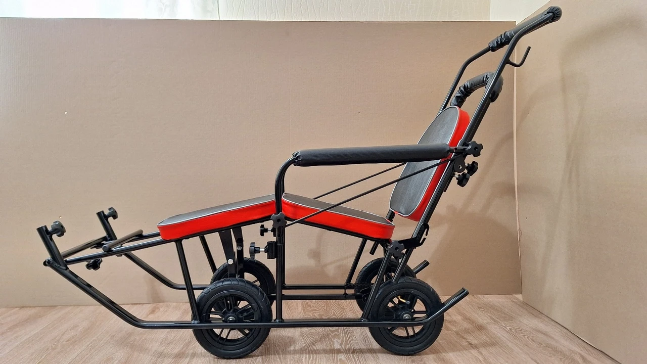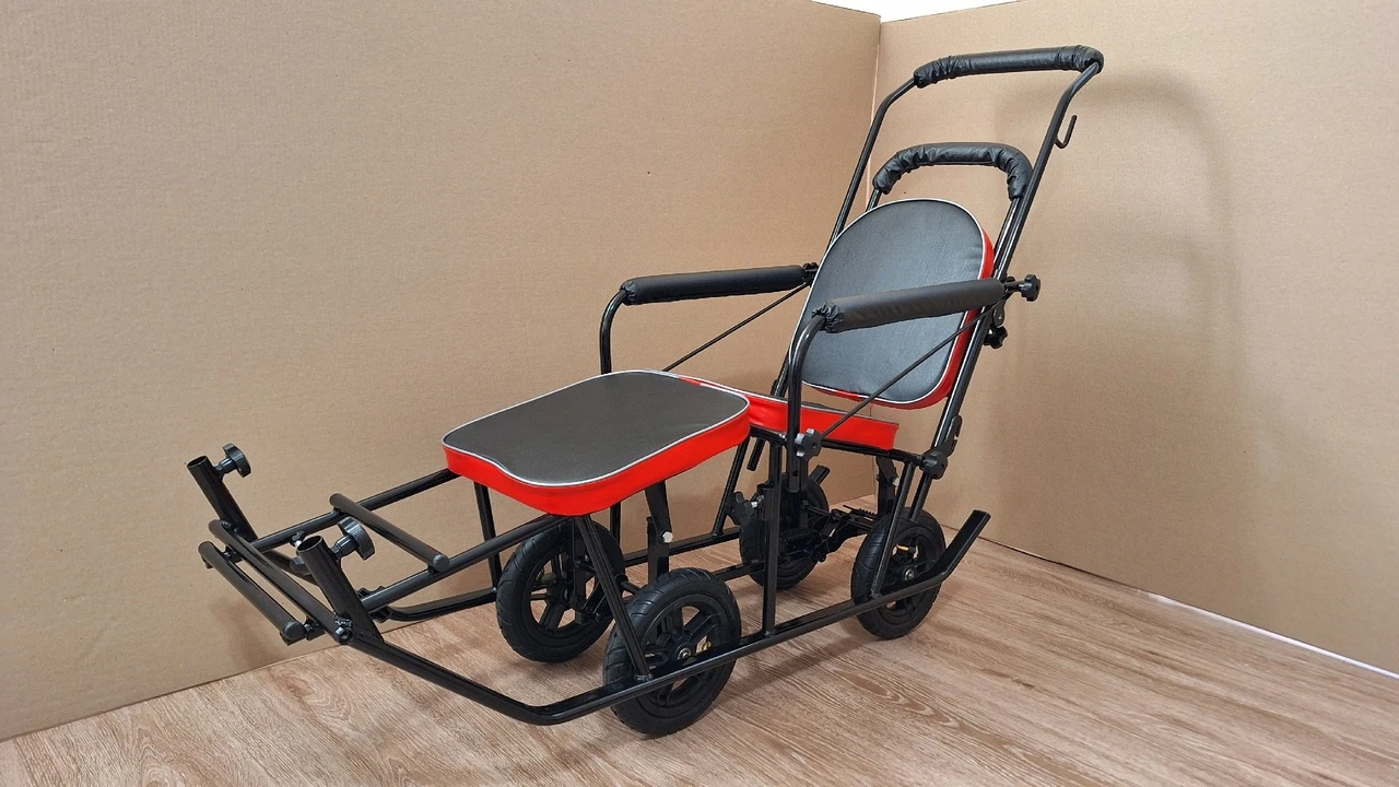 Санки для детей с ДЦП оснащены 4 выдвижными пневматическими колесами с наружными диаметрами шин 200 мм и шириной 40 мм, на шарикоподшипниках, установленных на оси 10 мм. Удобный и простой однопедальный механизм позволяет быстро и без усилий выдвинуть колеса и перекатить санки на участке без снежного покрытия. Вам не придется прикладывать физическую силу и царапать покрытие металлических элементов об асфальт.