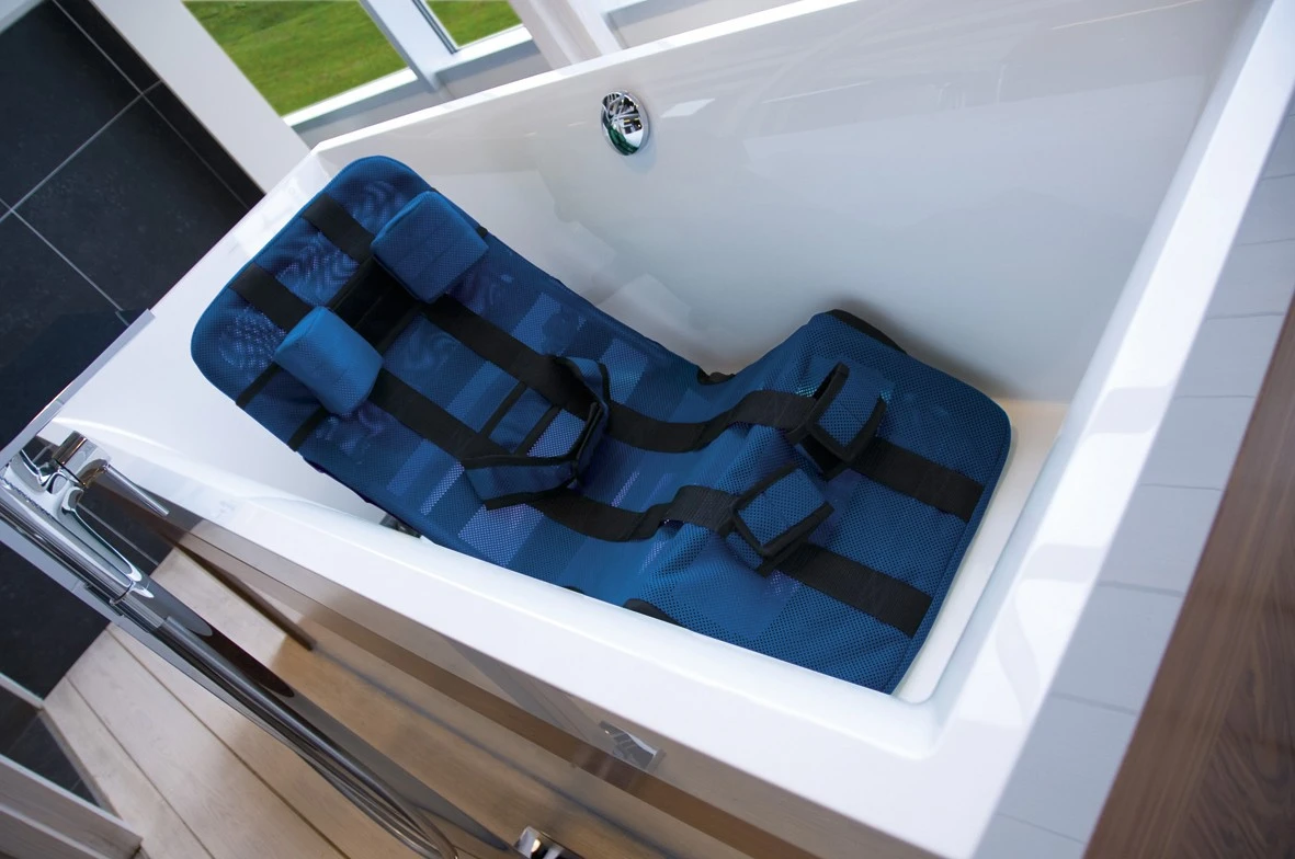 Для достижения наибольшей безопасности и правильному положению тела в сиденье, шезлонг для ванны оснащен системой ремней и подголовником, который может регулироваться как по высоте, так и по ширине. Чтобы не повредить дно ванной, опора имеет мягкие накладки по всей длине.