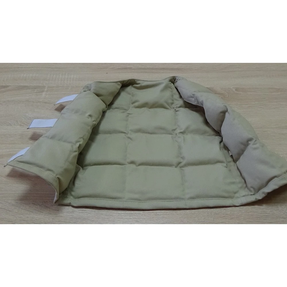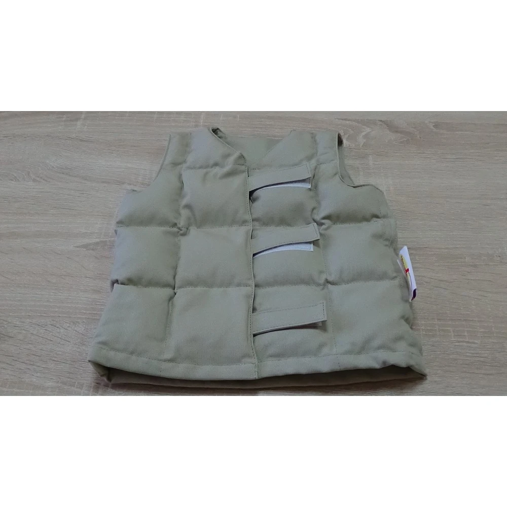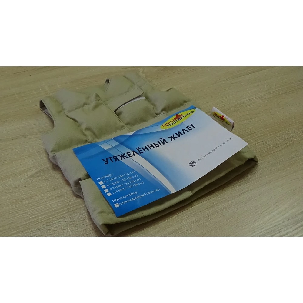 Жилет изготовлен из 100% хлопка, утяжеляющий наполнитель –гиппоаллергенный полимер.