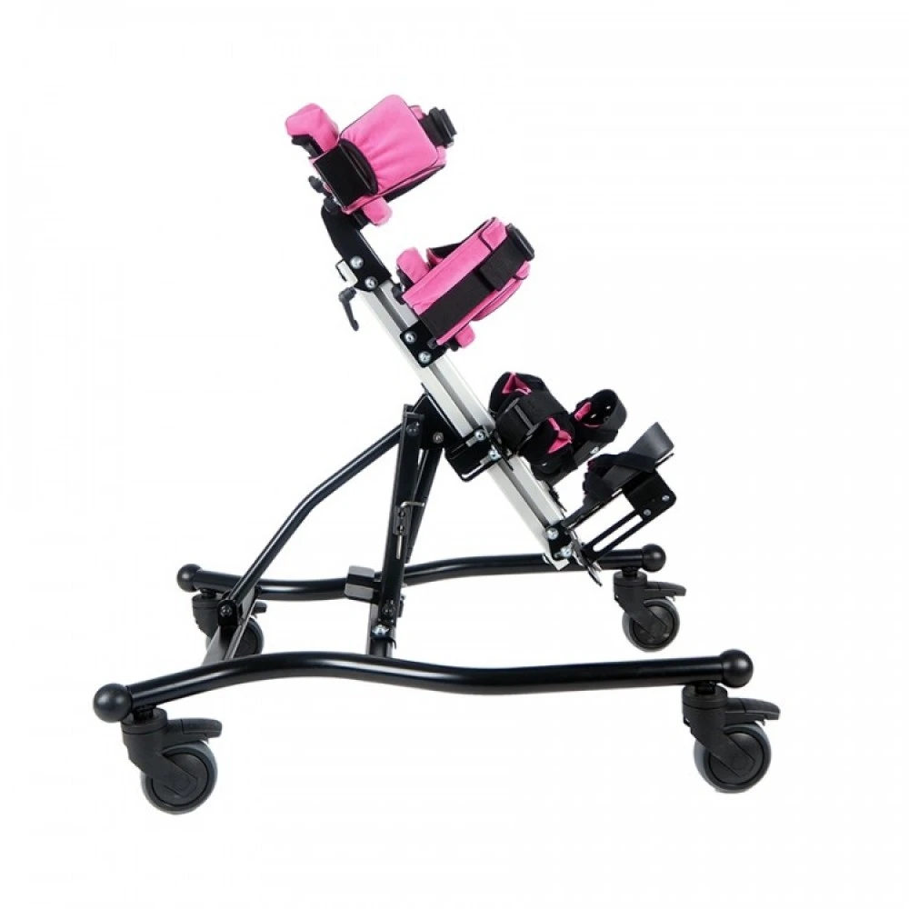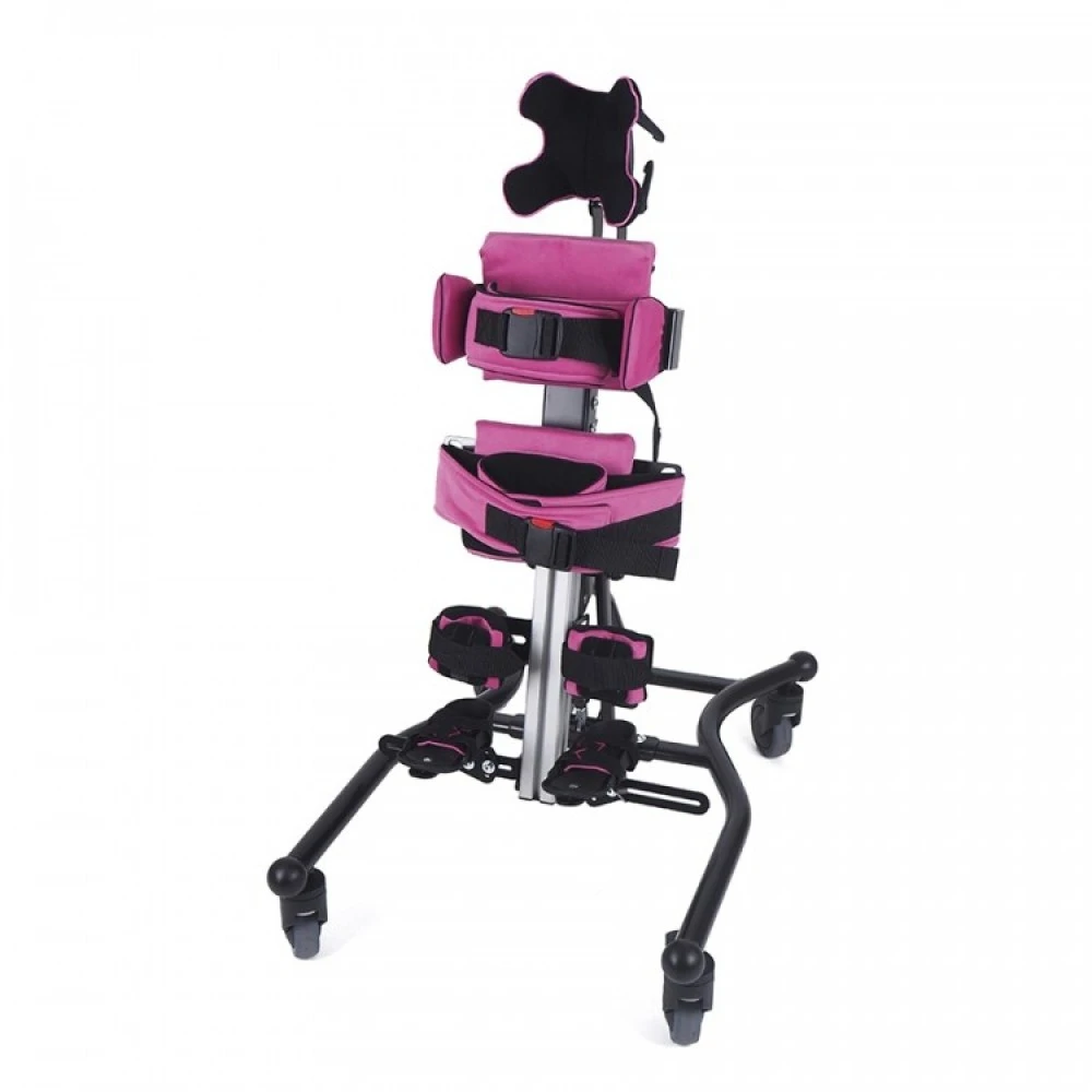 Устройство для безопасной вертикализации детей с нарушениями опорно-двигательного аппарата и ДЦП.Аппарат позволяет устанавливать угол отведения бедра в диапазоне от 0° до 35° для каждой ноги отдельно.Это обеспечивает правильное отведение ног, что способствует корректному положению тазобедренных суставов и предотвращает дисплазию.3D-платформы для ног позволяют настраивать различные корректирующие позиции для левой и правой стопы.Также есть возможность установки стопы в тыльное и подошвенное сгибание, а также супинацию и пронацию.Многопозиционные наколенники вместе с платформами для ног поддерживают правильную биомеханику колена, лодыжки и стопы.Голову ребенка удерживает гибкий контурный подголовник, который легко подстраивается под анатомические особенности и надежно фиксирует голову.Использование подголовника возможно как при передней, так и при задней вертикализации.Данное устройство особенно рекомендуется для детей с диагнозом вывих тазобедренного сустава, где вертикализация с двусторонним разведением ног имеет ключевое значение.