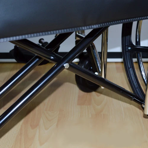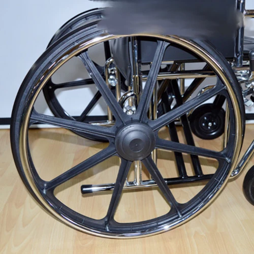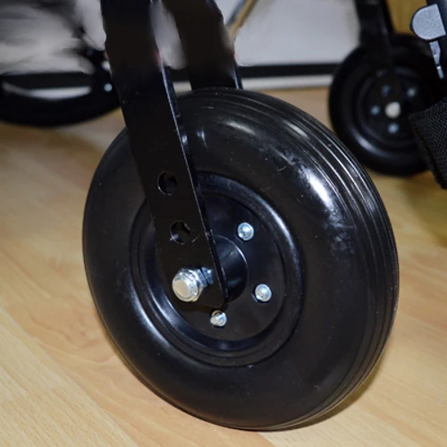 Несущая ось задних колес имеет увеличенный диаметр, обеспечивая устойчивость в процессе использования кресла. Шины изготовлены из резины, которая не оставляет следов на полу, сохраняя чистоту помещения.