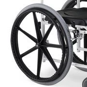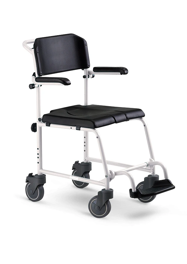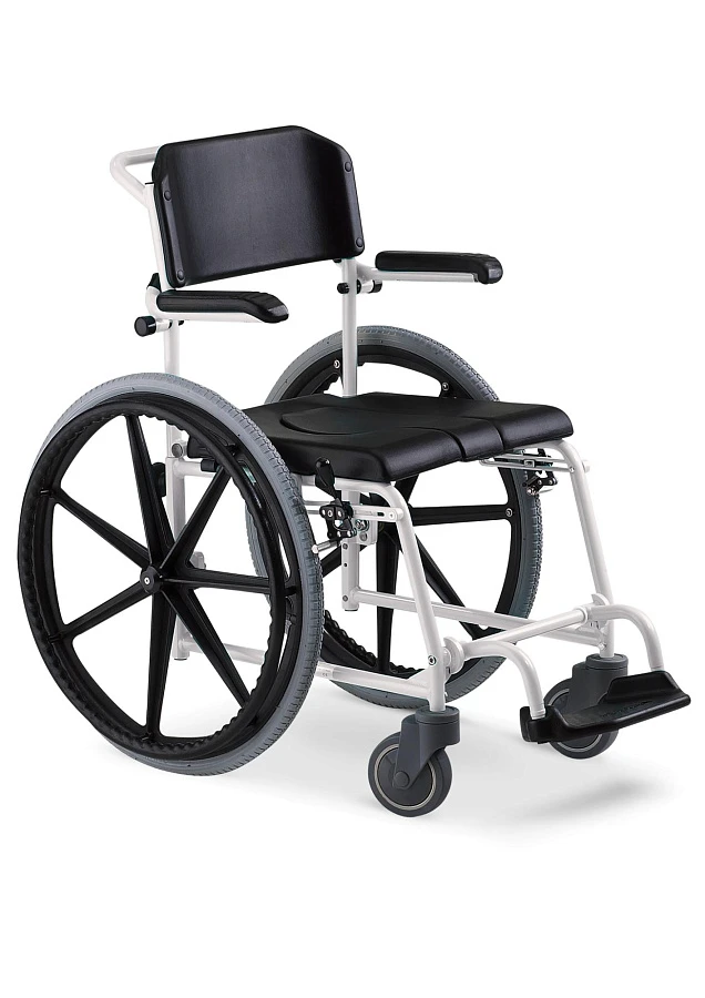 Кресло-коляска с санитарным оснащением предназначено для использования в помещении и вне его. Оно изготовлено из алюминиевых трубок, окрашенных порошковым напылением. Тем не менее кресло-коляска с санитарным оснащением не подходит для постоянного использования в соленой среде, например, в солевых ваннах или морской воде. Модель оснащена фиксатором насадочной оси, позволяющим быстро снять приводные колеса (24″). Коляска также имеет задние поворотные ролики с возможностью блокировки.