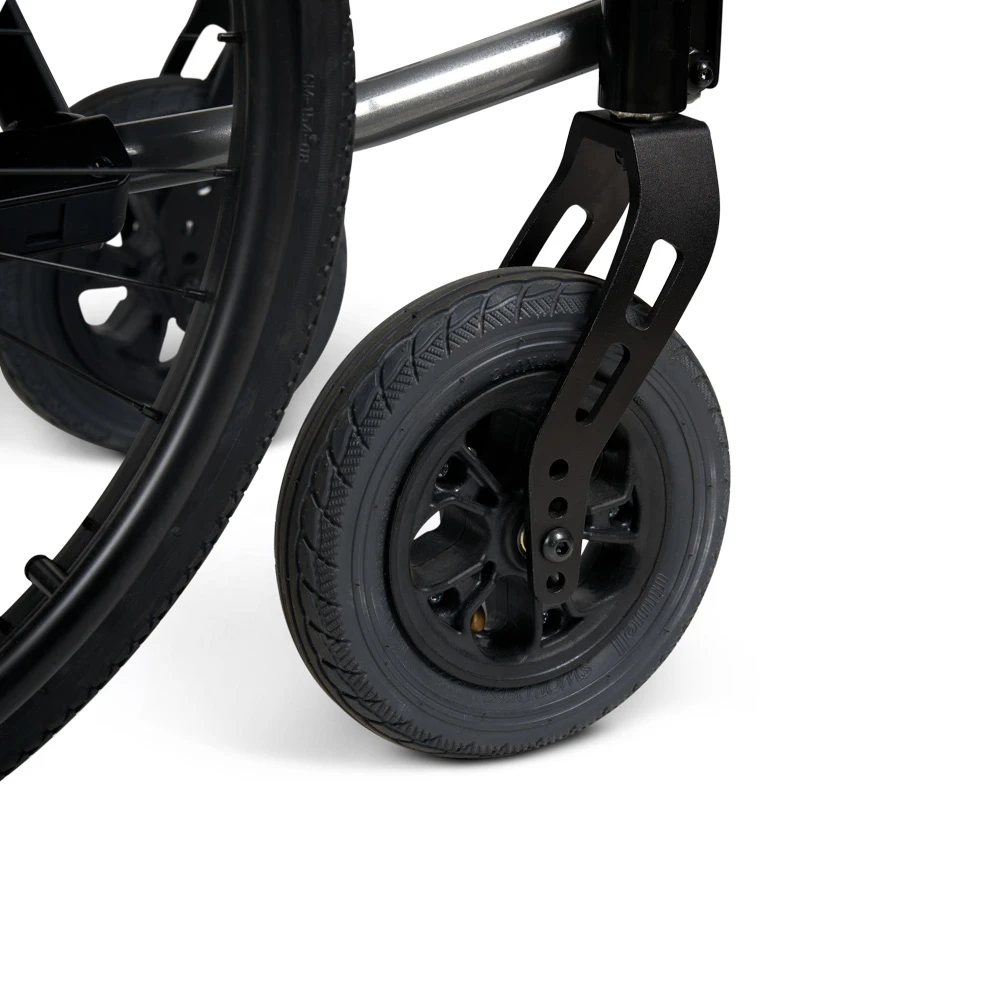 Две пары пневматических колес обеспечивают коляске плавность хода, а внедорожный протектор увеличивает проходимость. Коляска оснащена антиопрокидывателями, стояночным тормозом и ручками для сопровождающего лица.
