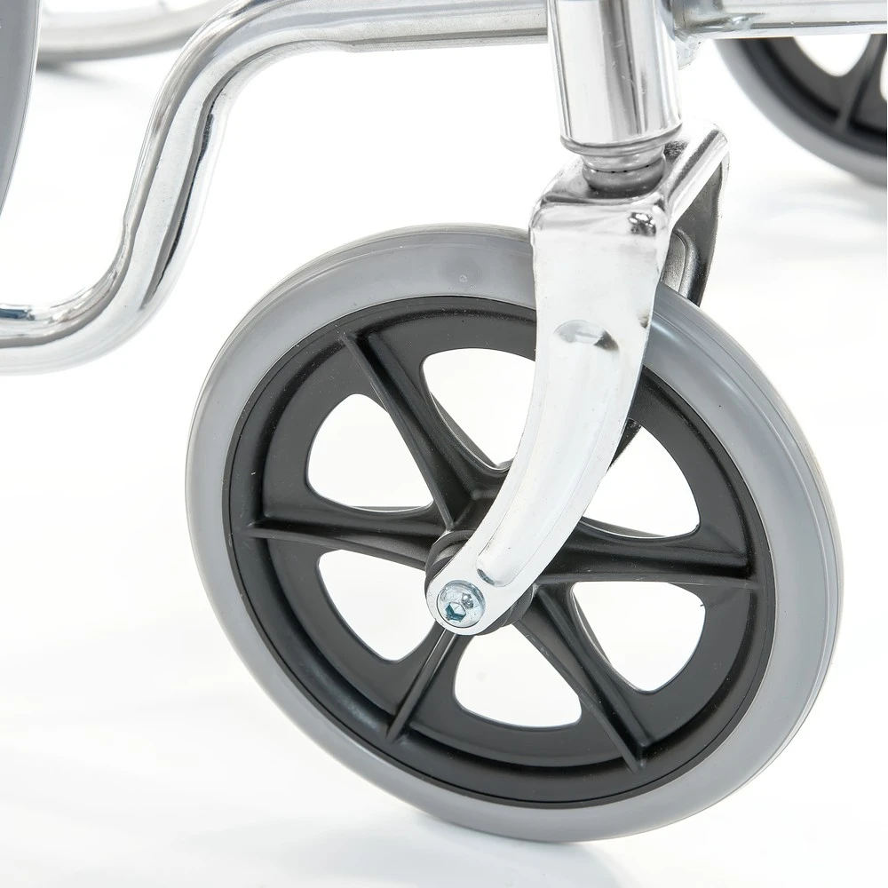 - Уверенное и беспрепятственное движение кресла-коляски гарантируется пневматическими задними и резиновыми цельнолитыми передними колесами, не требующими подкачки во время поездки.