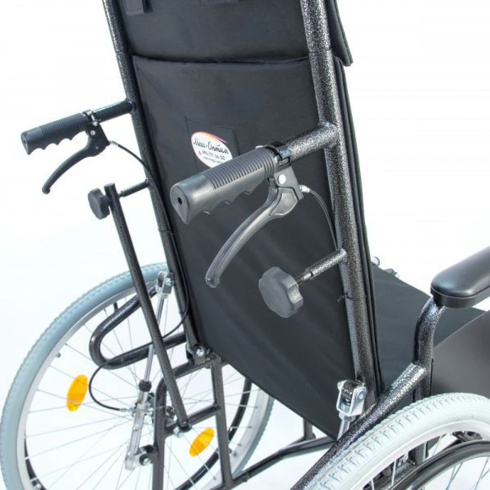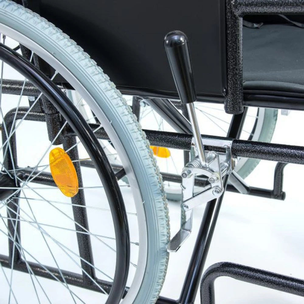 Кресло-коляска снабжена слева и справа рычагами стояночного тормоза, перемещением рычага можно осуществлять торможение кресла-коляски до полного блокирования.