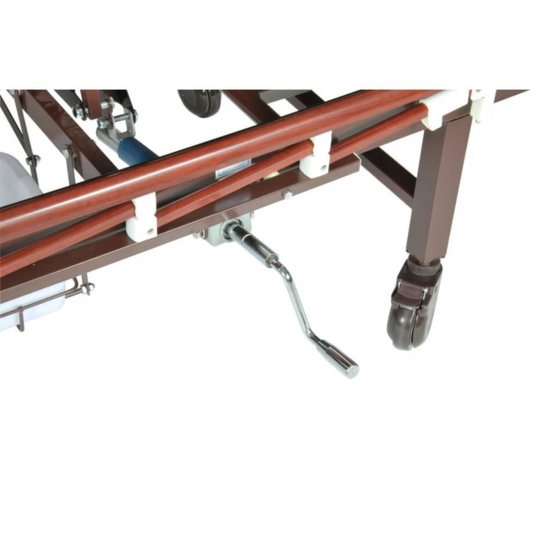 Торцы механической кровати (изголовье и изножье) выполнены из ламинированного ДСП, имитирующего натуральную древесину. Боковые ограждения металлические, легко складываются, что обеспечивает быстрый доступ к больному. За счет деревянных спинок кровать хорошо смотрится в любом домашнем интерьере.