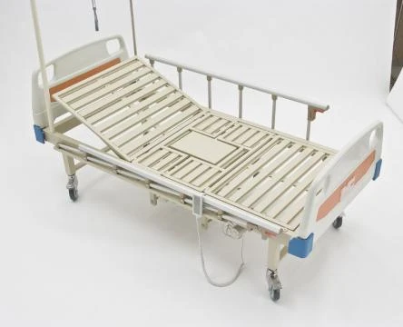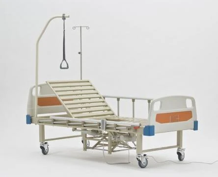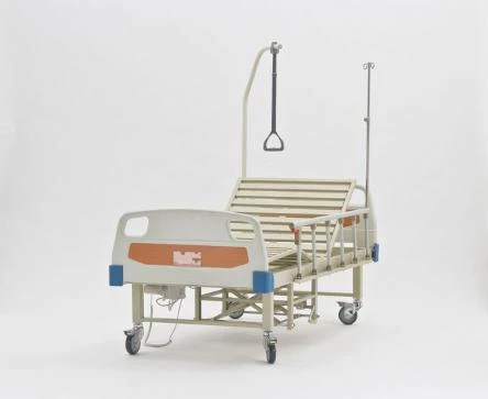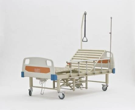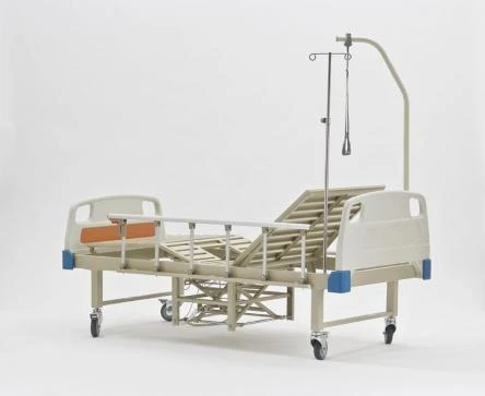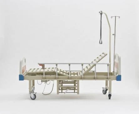 Медицинская кровать DB-10 (MM-53) с электроприводом и выдвижным туалетным устройством. 4-х секционное ложе сконструировано таким образом, что при вращении специального рычага в середине кровати открывается отверстие для размещения судна. Кровать оснащена съемными пластиковыми спинками и складными боковыми ограждениями, облегчающими доступ к пациенту. Угол наклона головной и ножной секций регулируется одновременно с помощью электропривода. Кровать поставляется в комплекте с матрасом.