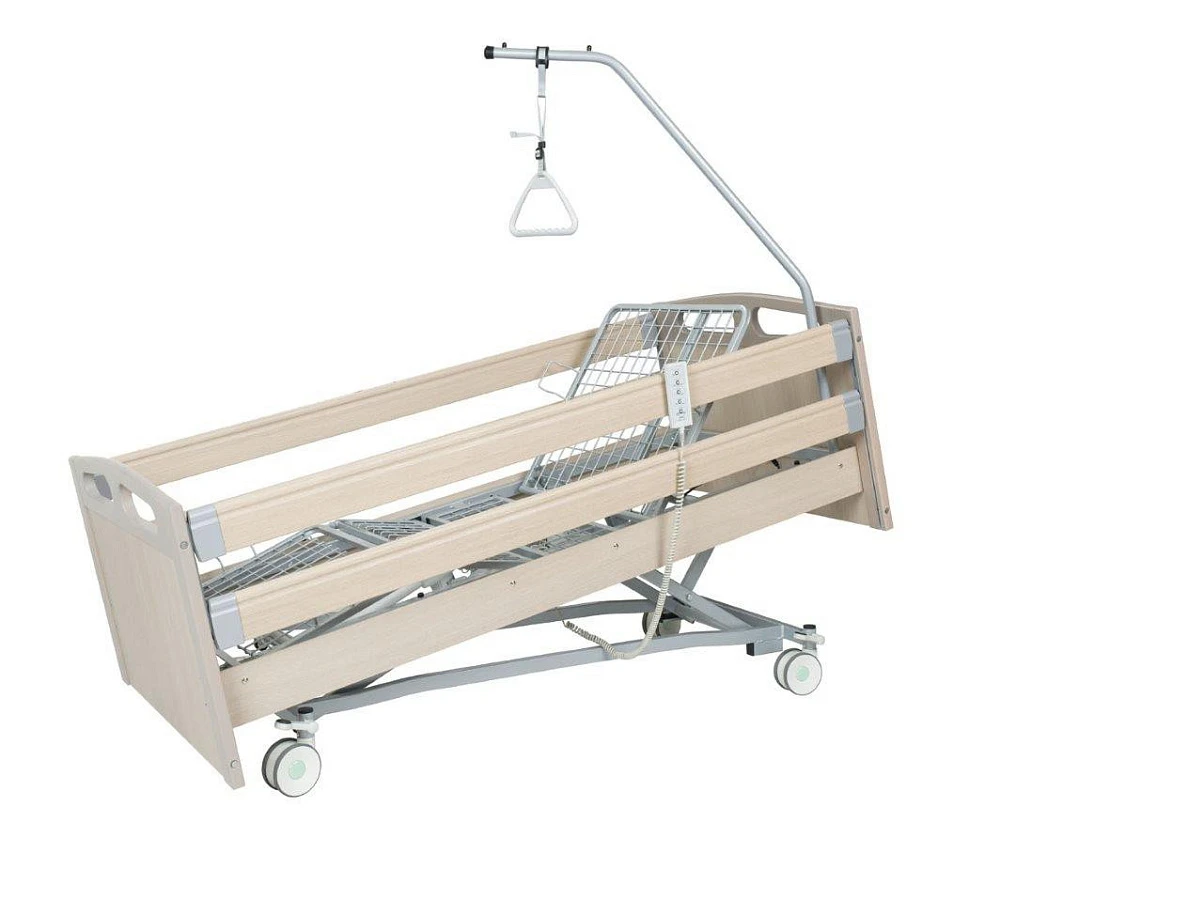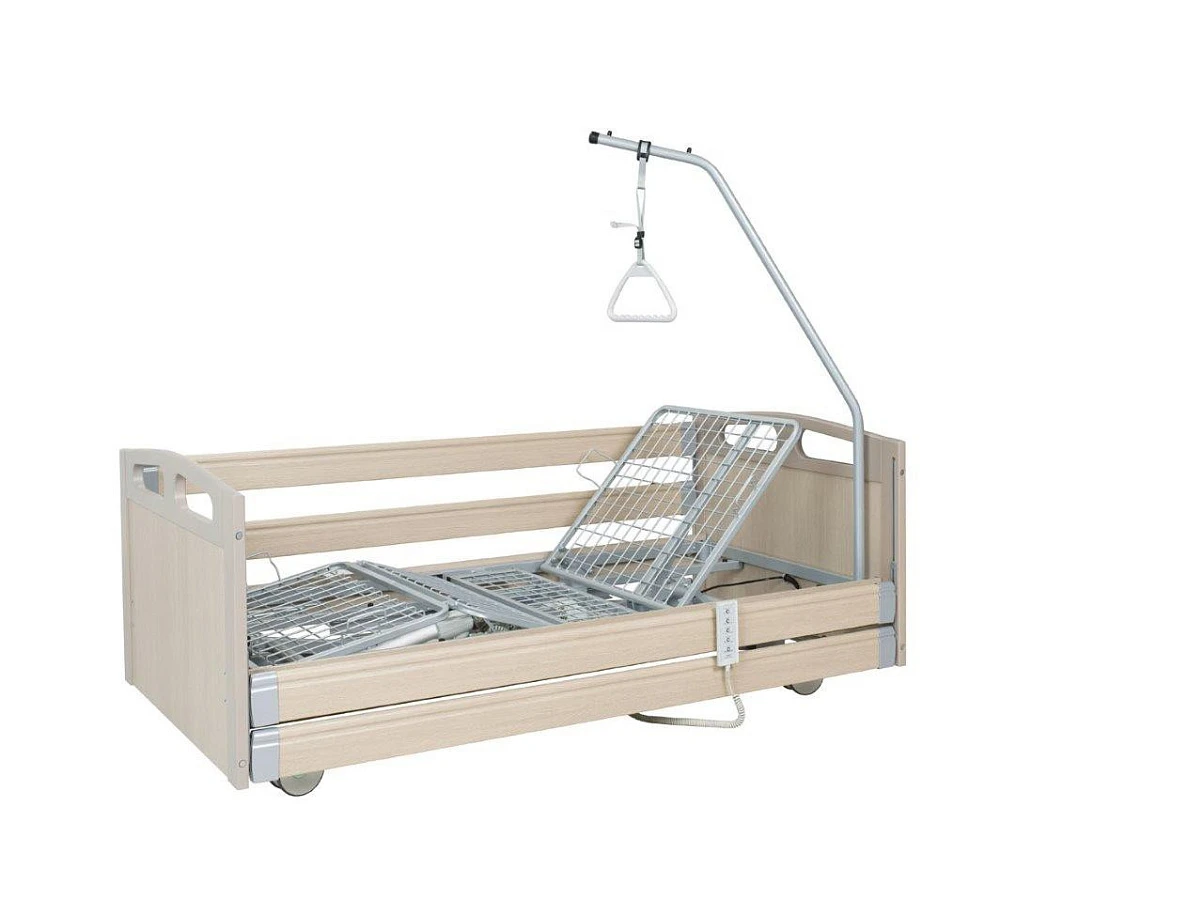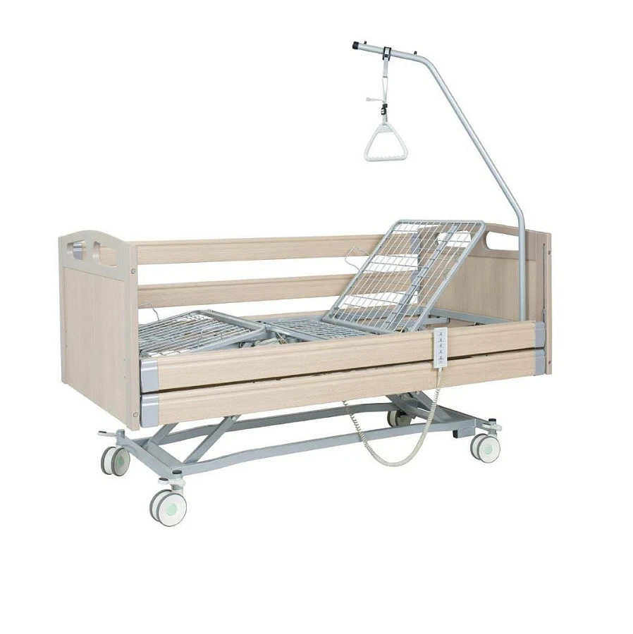 Эта модель имеет электрически регулируемую спинную и ножную секции. Вместе с кроватью покупатель получает устройство, помогающее пациенту подтягиваться на кровати с ручкой для удобного захвата. Высота секции спины и таза может быть отрегулирована. На модели стоят колеса с парной осевой блокировкой в головной и ножной секциях. Кровать легко перемещать. В комплекте с кроватью идет матраc.