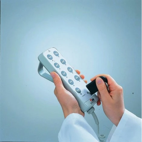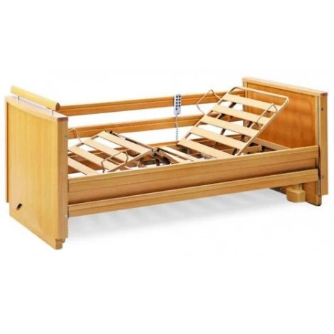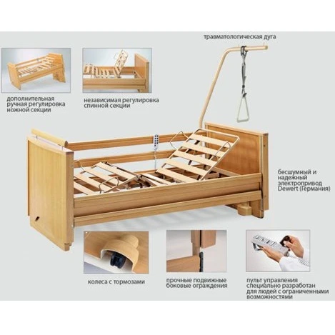 Кровать оснащена электроприводом "Dewert" (Германия), пультом дистанционного управления с возможностью блокировки клавиш магнитным ключом, подвижными боковыми ограждениями, а также двойными колесами "Tente" диаметром 50 мм с центральной блокировкой, спрятанными в корпус кровати. Ножная секция дополнительно регулируется вручную (механизм Rastomat). Имеется возможность экстренного опускания головной секции (в случае отключения электричества).