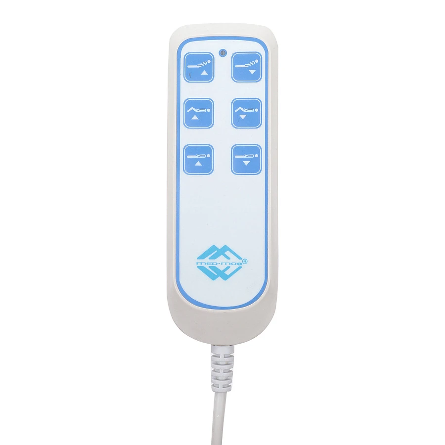 В комплектацию представленной модели электрической кровати входит пульт управления, который позволяет пациенту или медицинскому персоналу легко регулировать положение устройства. С помощью пульта можно изменять положение спинки и ног, а также регулировать высоту кровати.