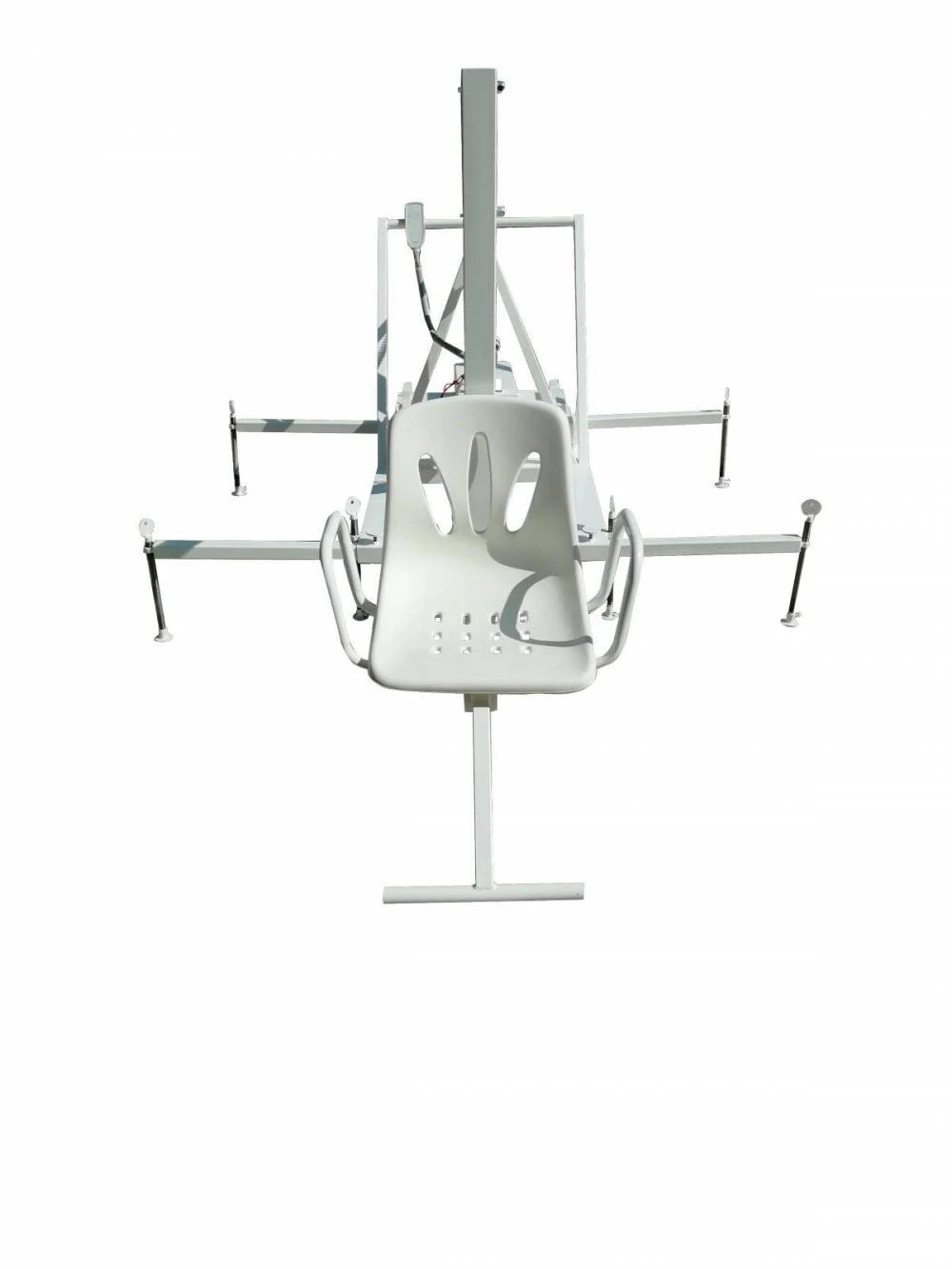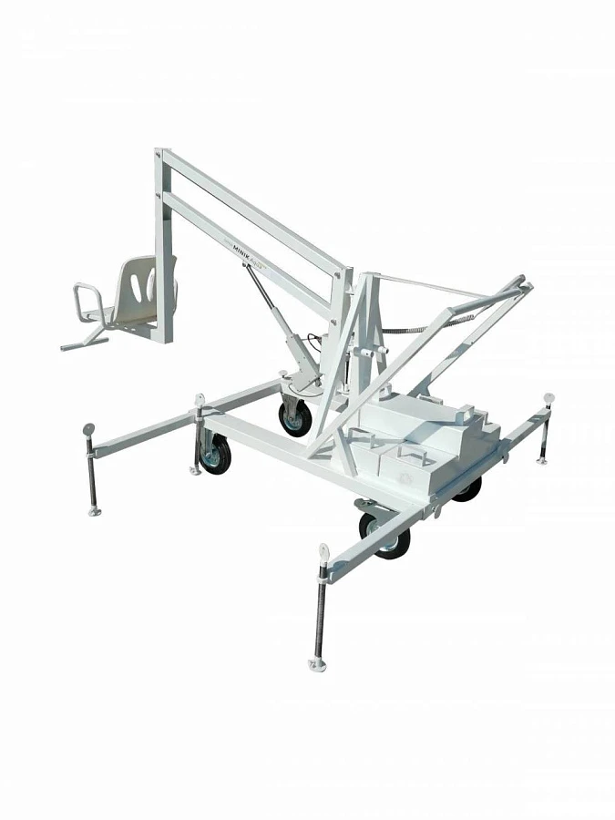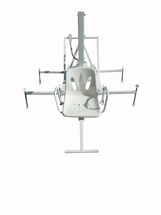 Такой подъемник рекомендуется для бассейнов с узкими проходами, затрудняющими частые маневры. Подъемник помимо противовесов имеет выдвижные опорные лапы и упорные винты, препятствующие скатыванию в воду. Подъемник достаточно один раз установить у края бассейна, выдвинуть опорные лапы, зафиксировать тормоза на колесах и закрутить стопорные винты. После этого им можно пользоваться как обычным стационарным подъёмником. Спуск-подъем – при нажатии кнопок на пульте электропривода, поворот в сторону поворотной консоли с человеком в ручном режиме.