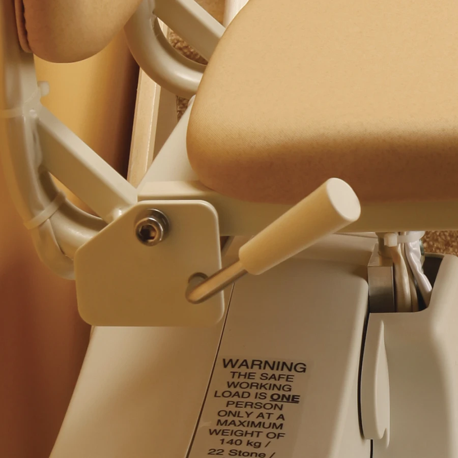 Оснащен датчиками, гарантирующими остановку кресла в случае появления препятствия на лестнице. Поясной ремень безопасности обеспечивает поддержку. Аварийный выключатель на подлокотнике мгновенно остановит подъемник при необходимости по желанию пользователя.