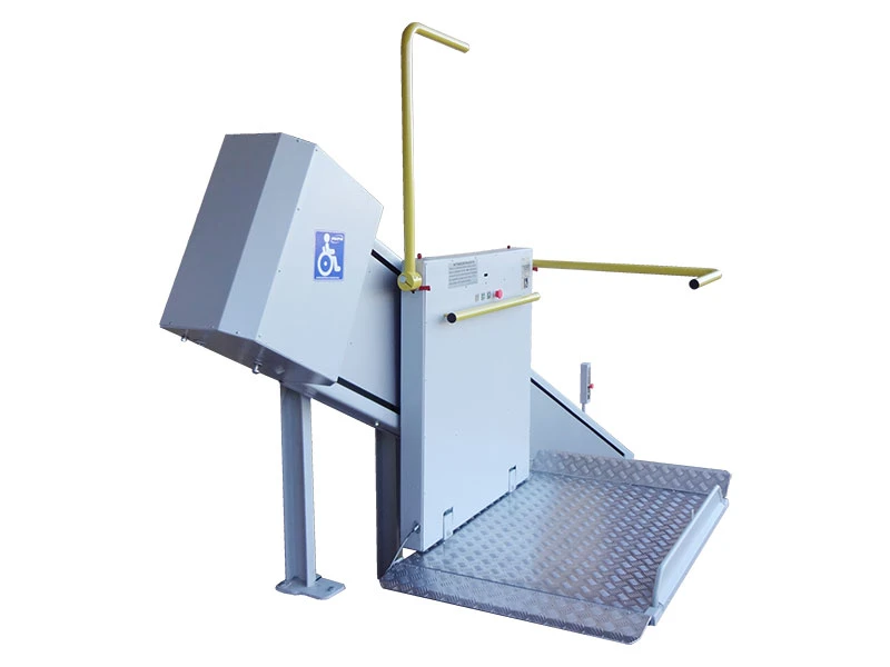 - Откидными пандусами и поручнями, которые препятствуют скатыванию кресла-коляски во время движения подъемника.