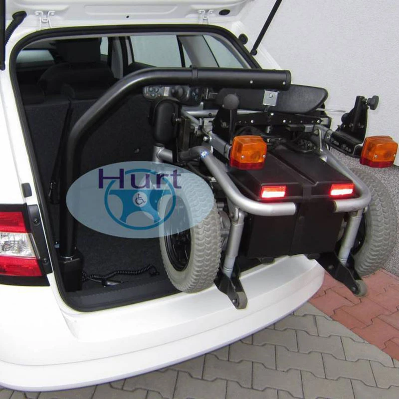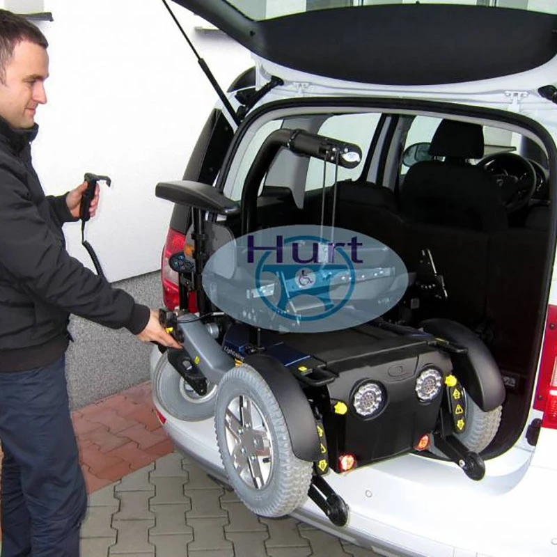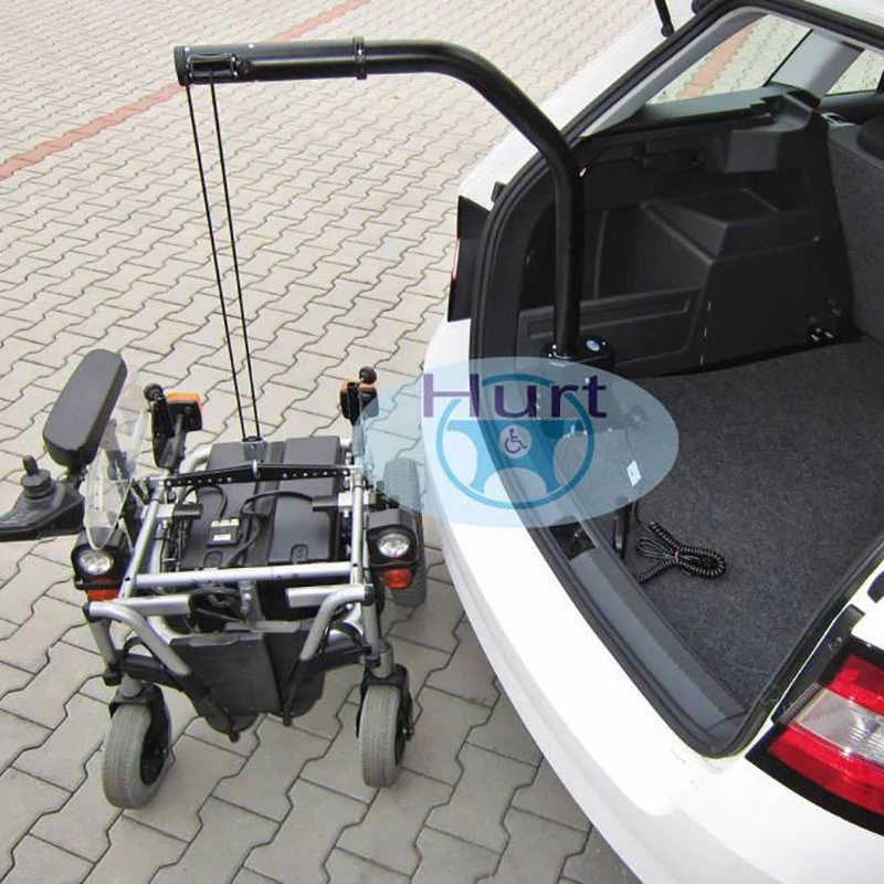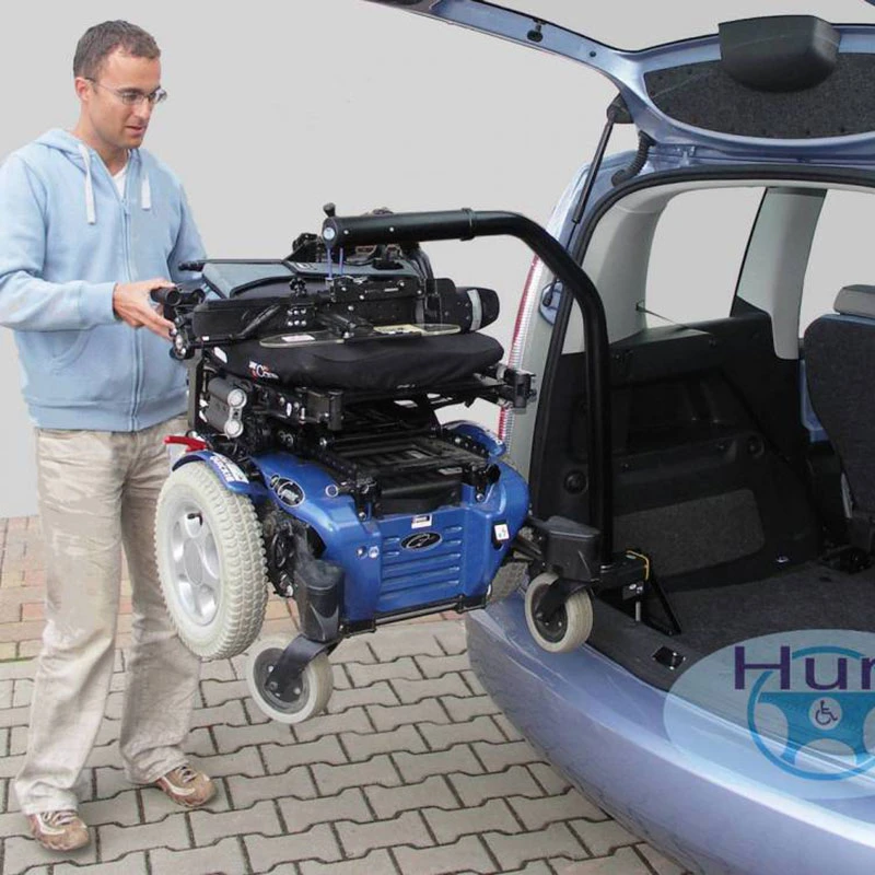 Есть два типа подъёмника с ручным поворотом стрелы внутрь багажника и с электрическим поворотным механизмом. Устройство питается от бортовой сети, благодаря ему женщина или пожилой человек, сможет убрать в багажник любого автомобиля электроколяску весом 100 и более килограмм.