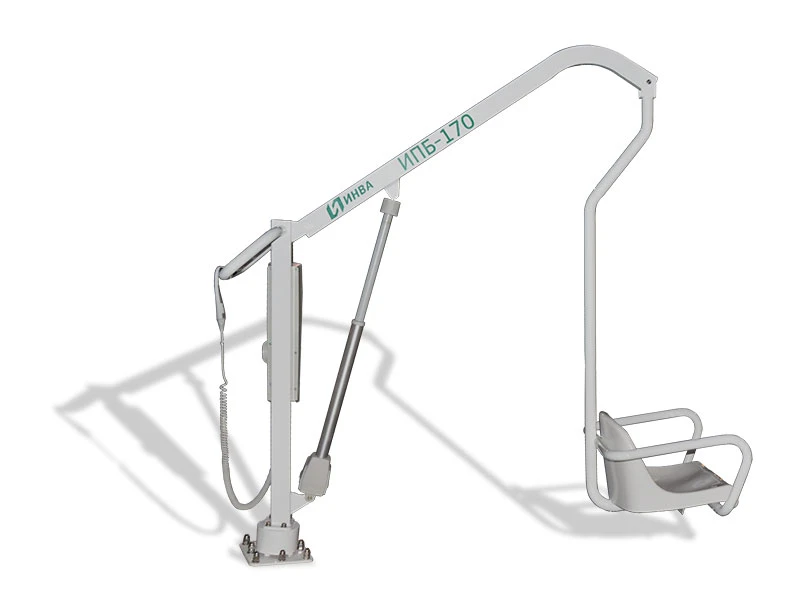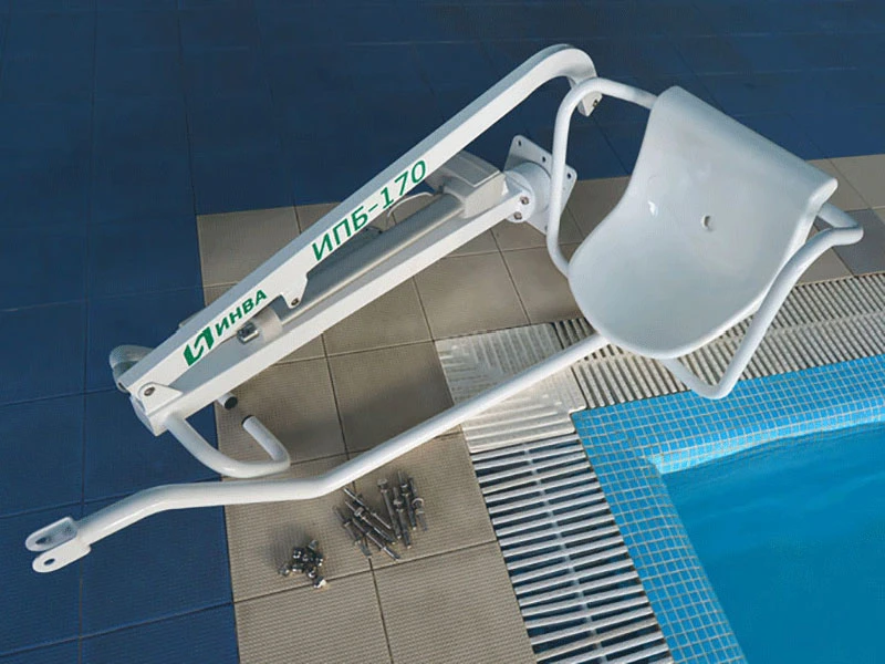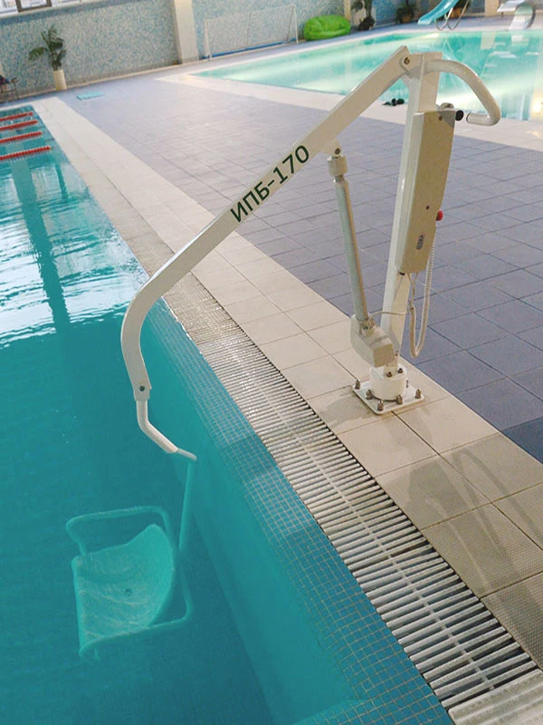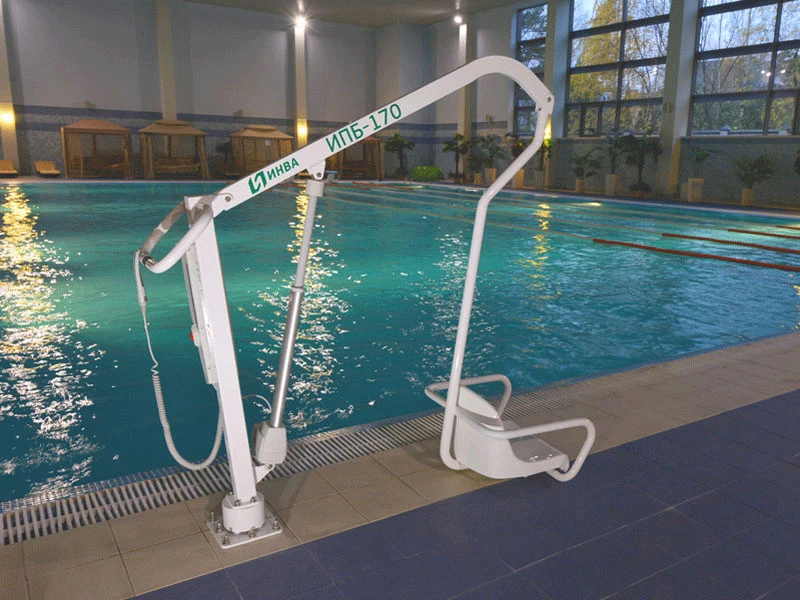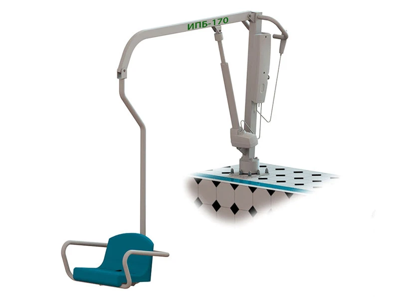 ИПБ-170Э стационарный подъемник для инвалидов предназначен для перемещения, подъема и опускания человека в бассейн. Перемещение, подъем и опускание человека с нарушением функций опорно-двигательного аппарата с помощью подъемника ИПБ-170Э с электроприводом, в/из бассейн(а).