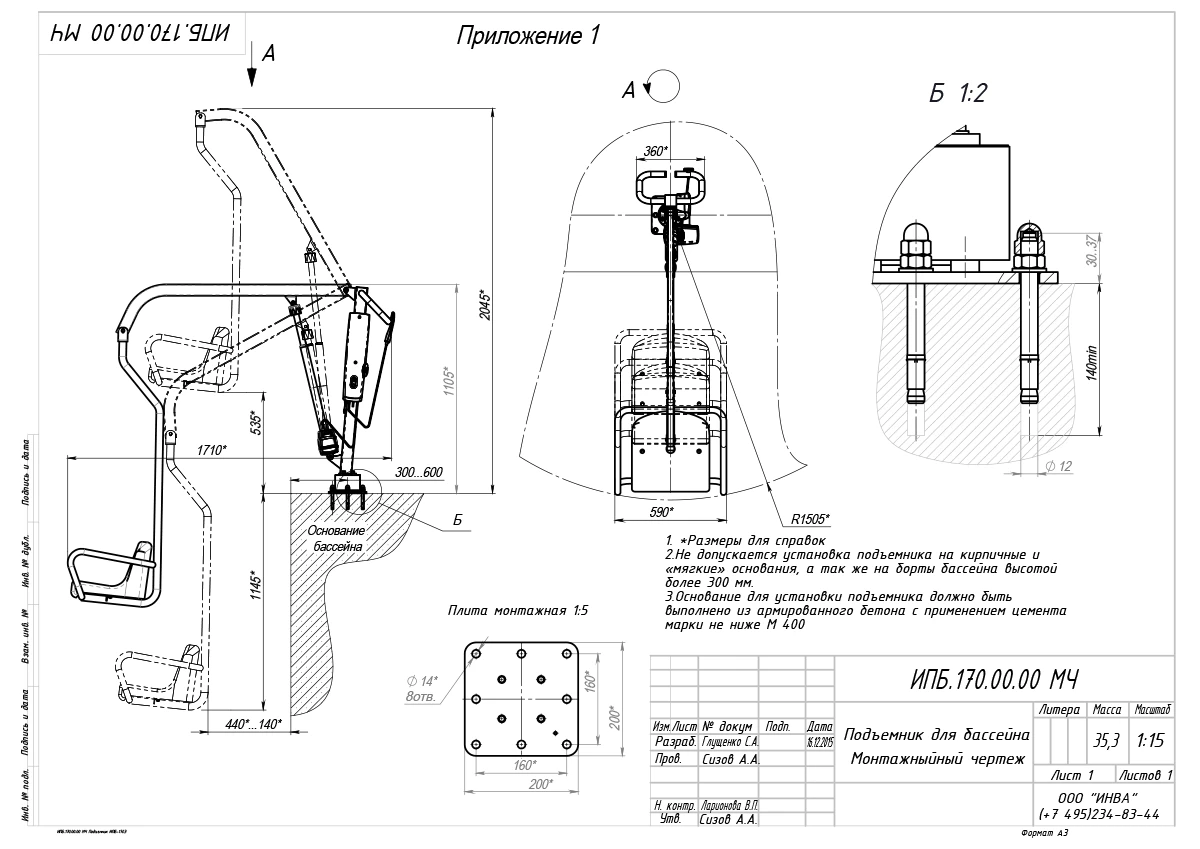 ВНИМАНИЕ: не допускается установка подъемника на кирпичные и "мягкие" основания. Основание для установки подъемника должно быть выполнено из армированного бетона с применением цемента марки ни ниже М 400.