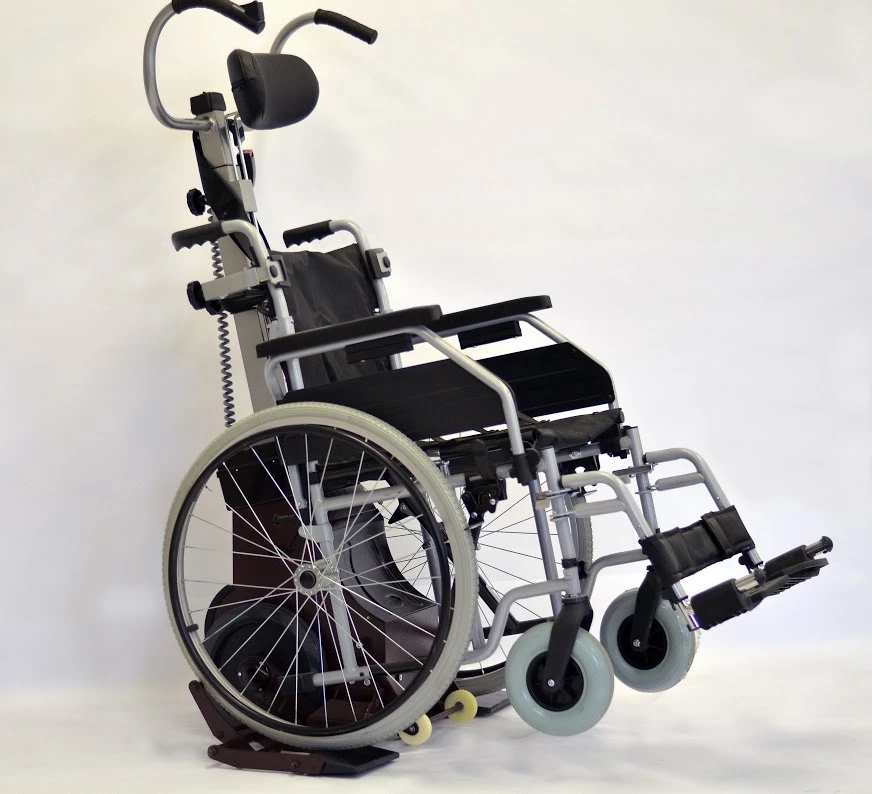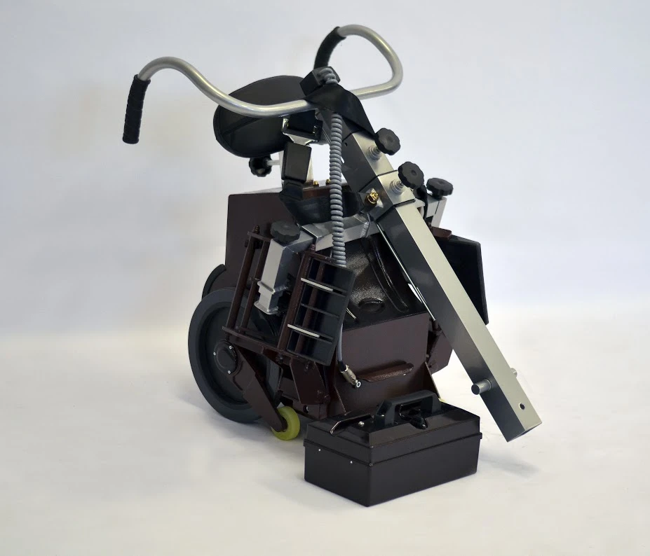 - Опоры колёс кресла-коляски закреплены в передней части боковин корпуса и выполнены откидными для уменьшения габаритов агрегата при его транспортировке