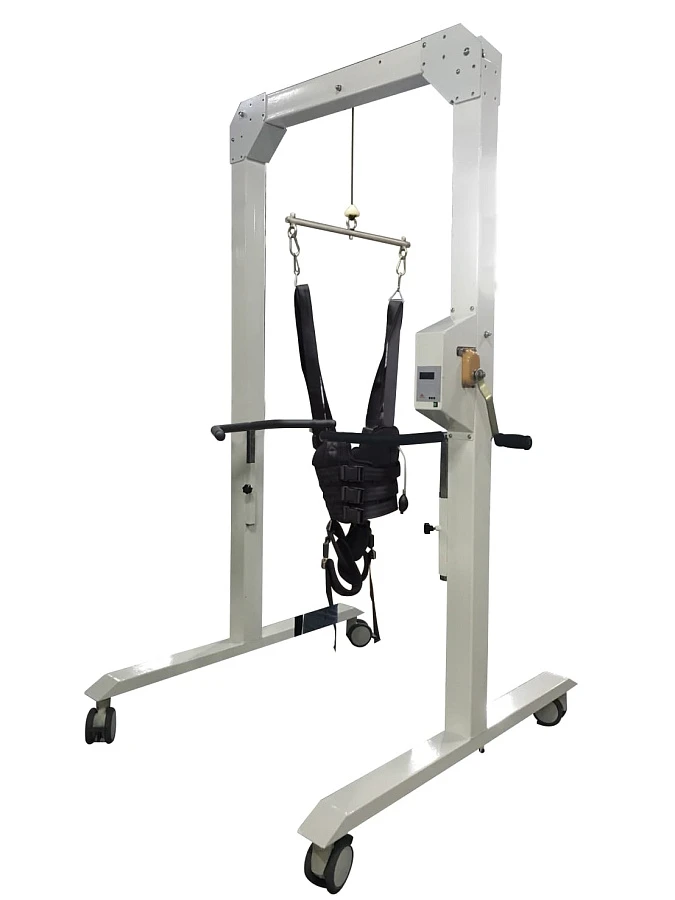 - Подвес оснащен ручным (механическим) приводом для разгрузки веса пациента. С его помощью на ноги и позвоночник тренирующегося можно снизить или полностью избавить от тяжести собственного веса.