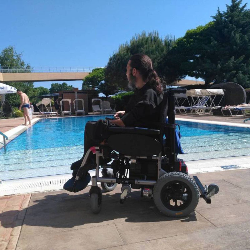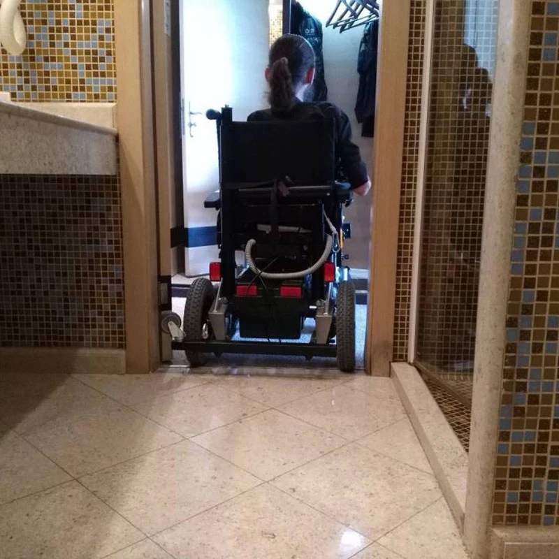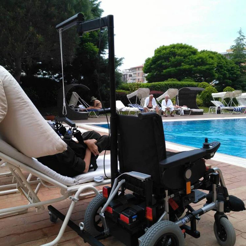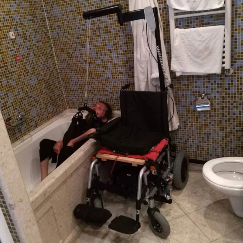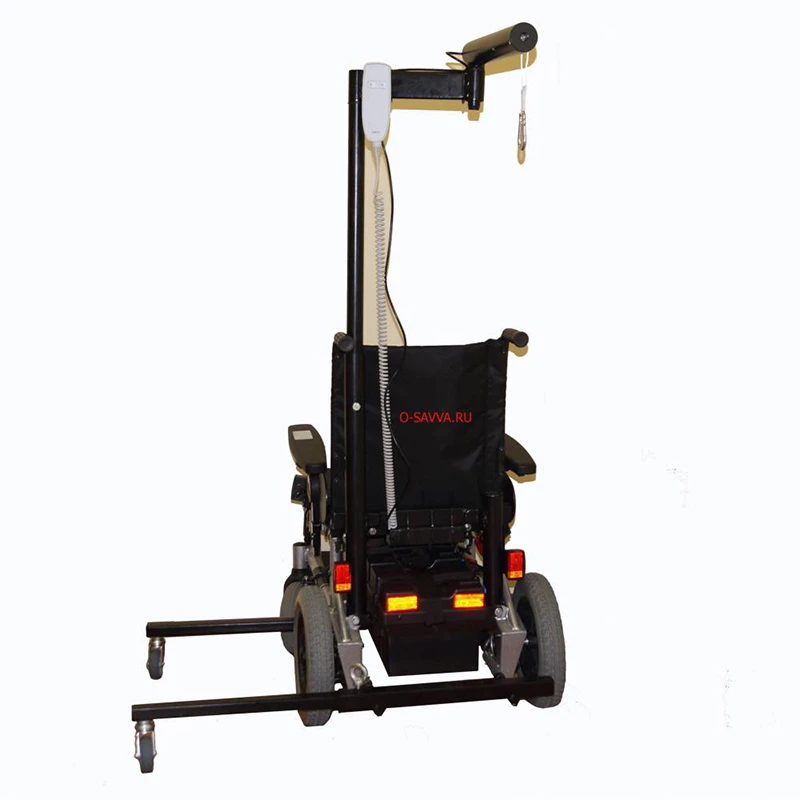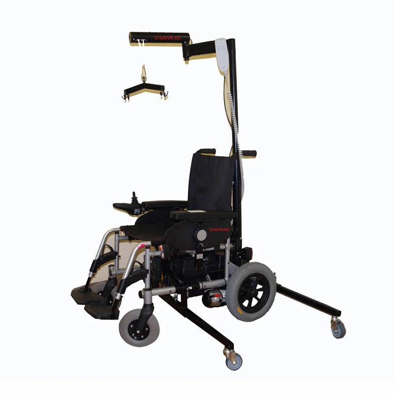 Инвалидное кресло-коляска с электроприводом Meyra Clou 9.500, оснащённое подъёмным устройством для пересаживания – реабилитационной лебёдкой Savva. Это электрическое устройство позволяет переместить больного человека в ванну, на туалет, на кровать, поднять с уровня пола, и в некоторых случаях даже опустить в бассейн или посадить в автомобиль.