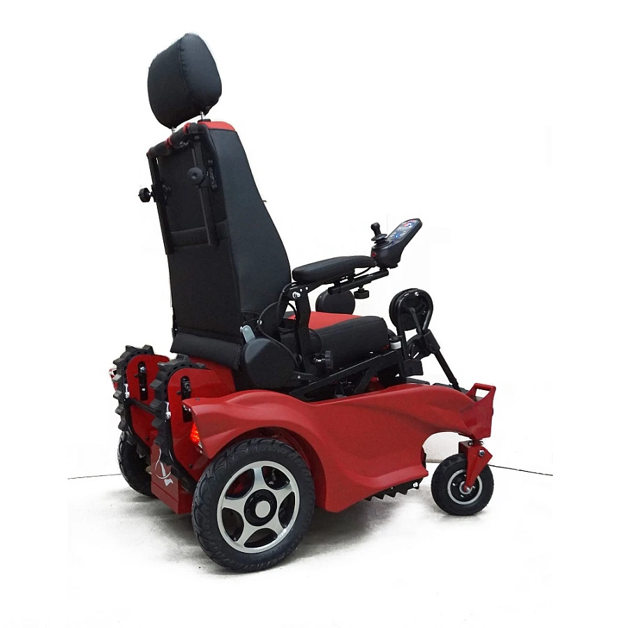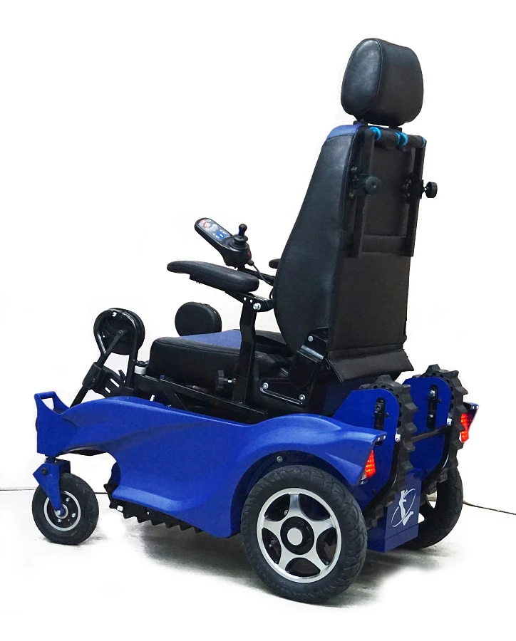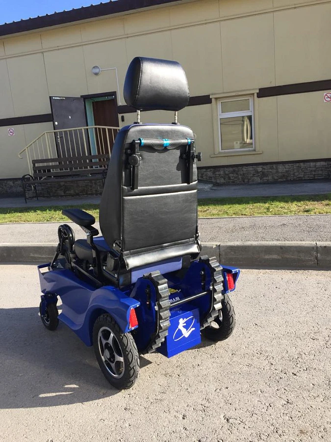Инновационное сочетание колесного и гусеничного привода помогает пользователю инвалидной коляски быть максимально независимым. Колесный режим используется для комфортного движения по дорогам, а гусеничный ход необходим для преодоления лестниц и бордюров. Пневматические колеса позволяют использовать коляску на легком бездорожье и преодолевать порожки до 5 см.