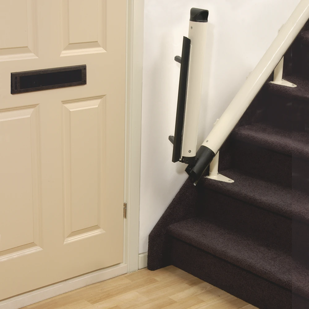 Движется по одной направляющей, установленной вдоль внешней стороны лестничного марша.