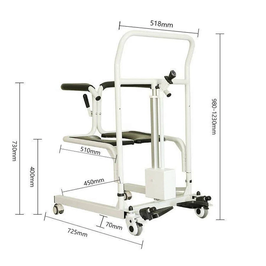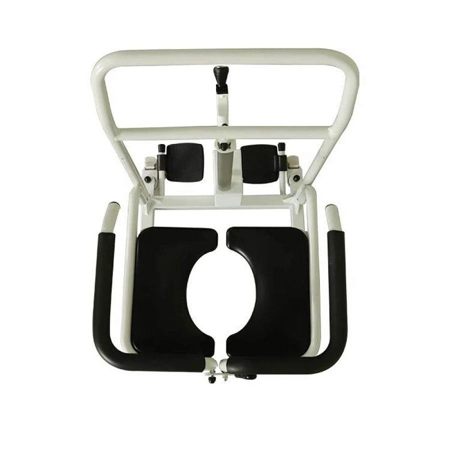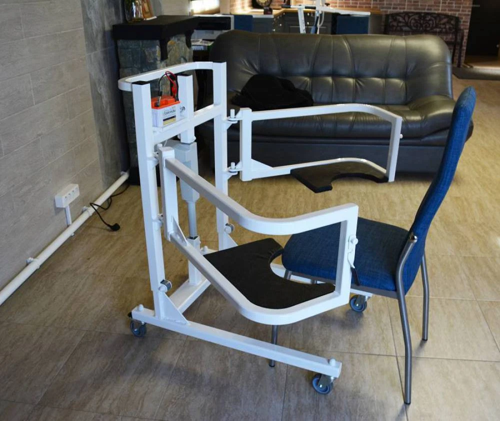 Удобный механизм раздвижного сиденья с отверстием для туалета позволяет без усилий перемещать пациента в положении «сидя»: на кровать, инвалидное кресло, стандартный унитаз, судно, любые другие горизонтальные поверхности. Дополнительно может устанавливаться санитарное оснащение. Захват производится путем заведения половинок сиденья по ягодицы. Подножки обеспечивают опору ног пациенту. С помощью электрического привода происходит перемещение «вверх» - «вниз».