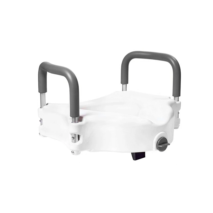 - Пластиковая насадка на унитаз со съемными поручнями увеличивает высоту унитаза.