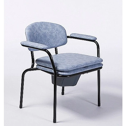 Комфортный туалет-стул с санитарным оснащением Vermeiren 9062, мягким сиденьем и подлокотниками. Оснащен съемным санитарным ведерком, без которого может использоваться как обычный прикроватный стул. Все контактные поверхности стула мягкие: сиденье, крышка, спинка и подлокотники. Спинка имеет анатомический изгиб, повторяющий линию спины. Ножки стула обуты в резиновые наконечники, предотвращающие скольжение.