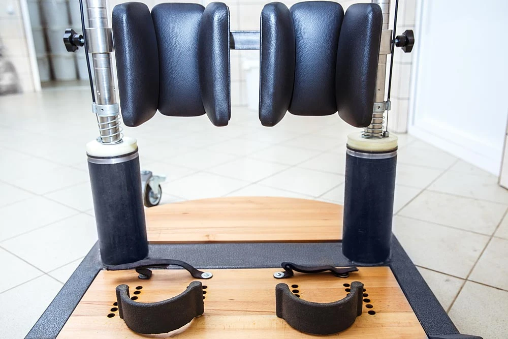 Особого внимания заслуживает конструкция тренажера, обеспечивающая дополнительную стабилизацию в области туловища и поясницы. Это создает комфортные и безопасные условия для выполнения упражнений, в том числе с пациентами, имеющими значительные ограничения подвижности.